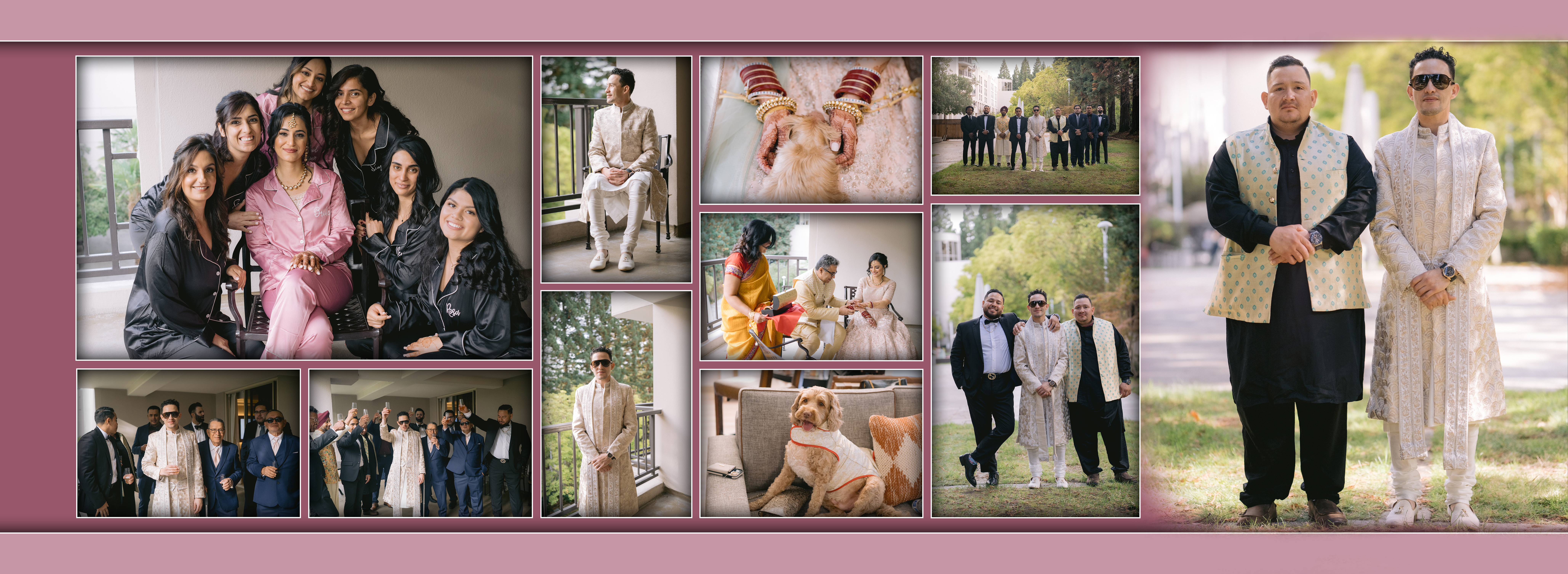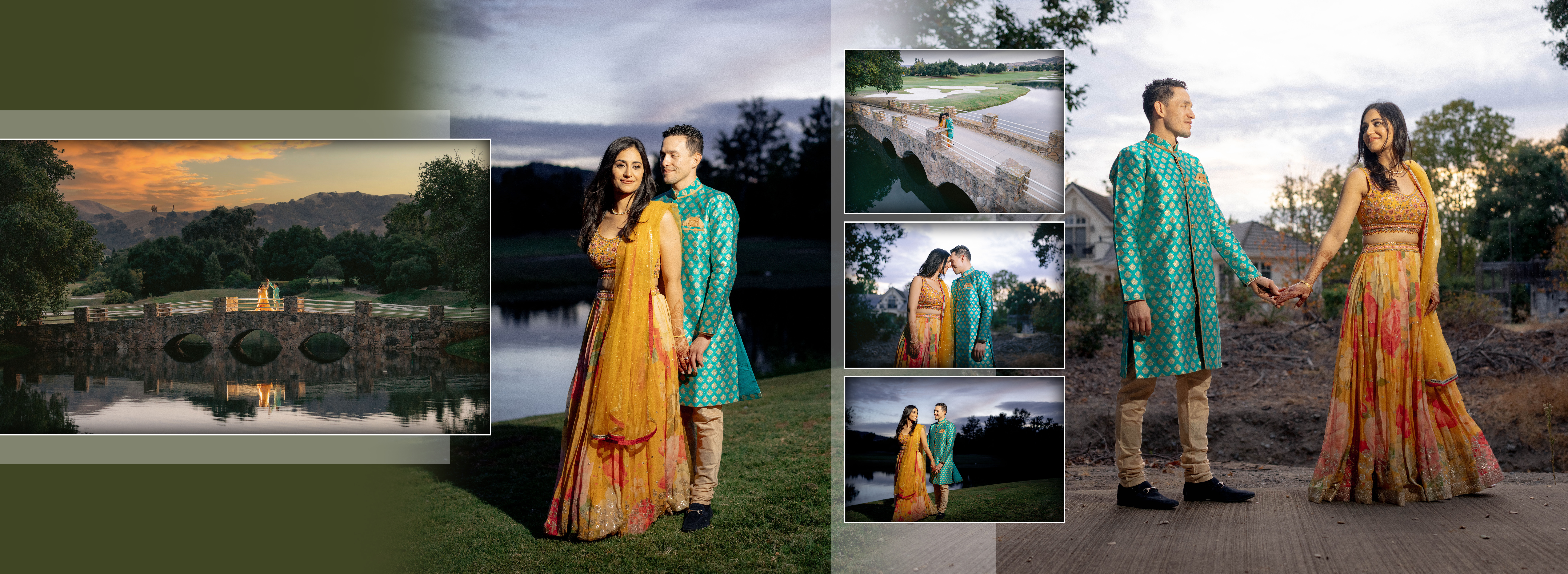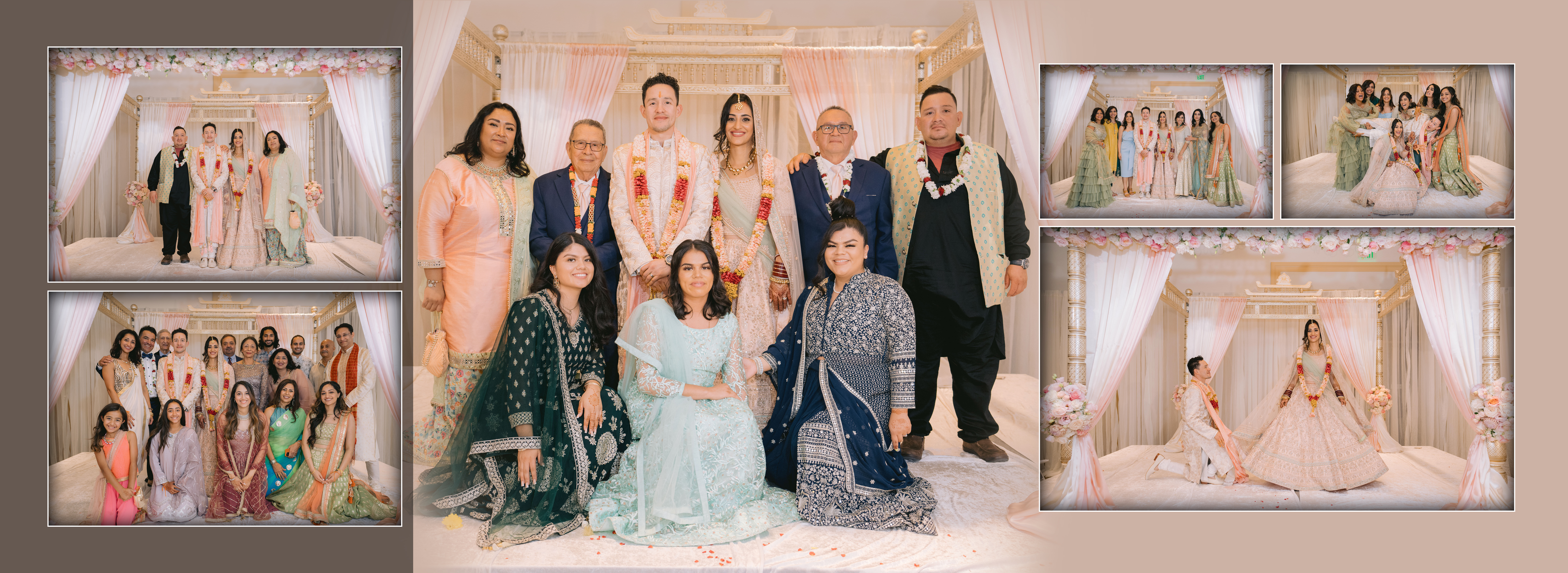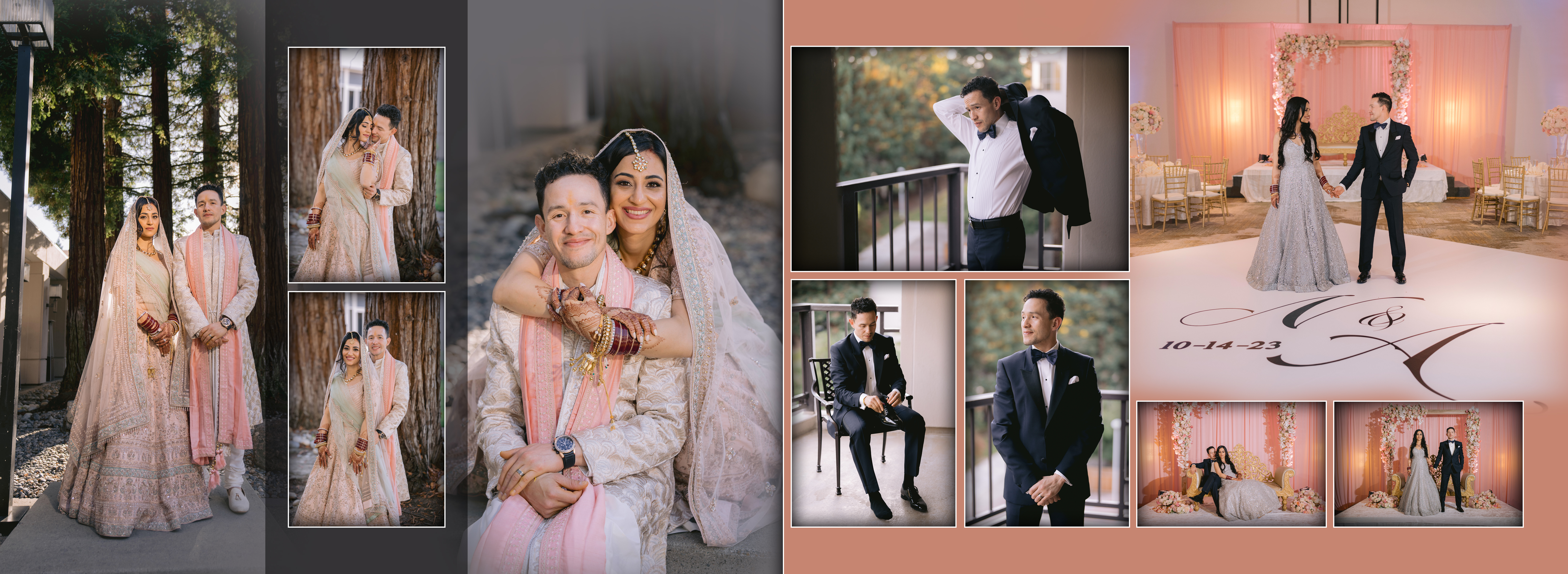 Below is an example of a fusion wedding with a Nicaraguan groom and North Indian bride at San Ramon Marriott. The first spread is the full cover image that was under a beautiful acrylic finish, and the twenty album spreads in order follow it.