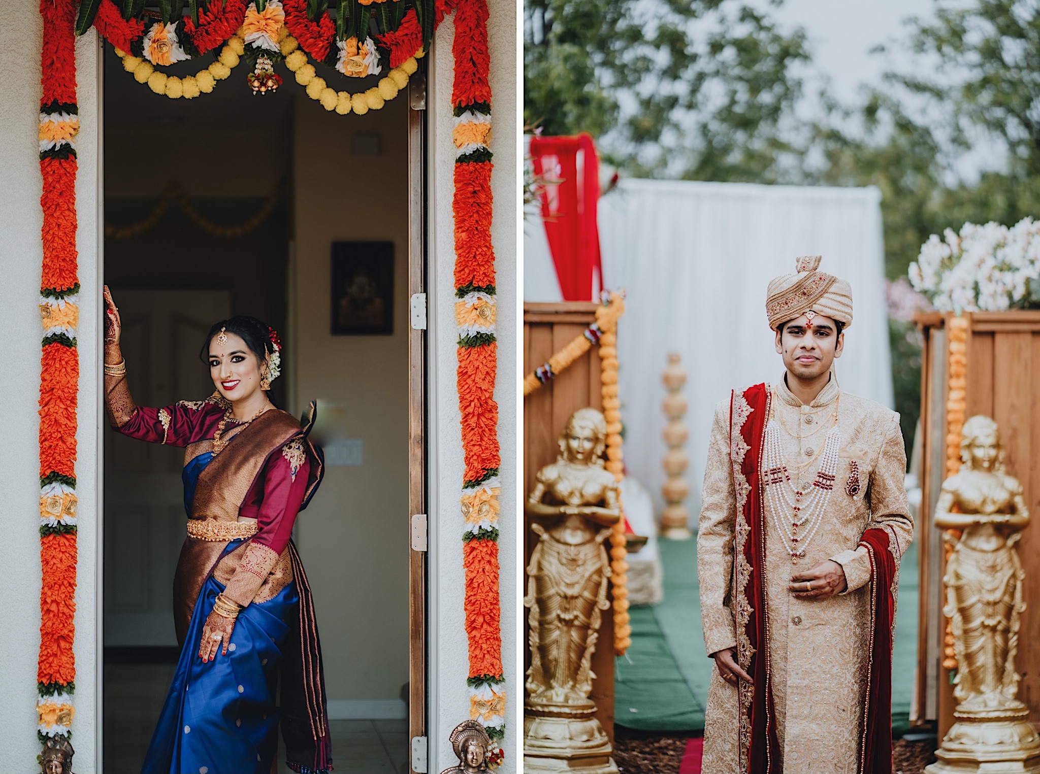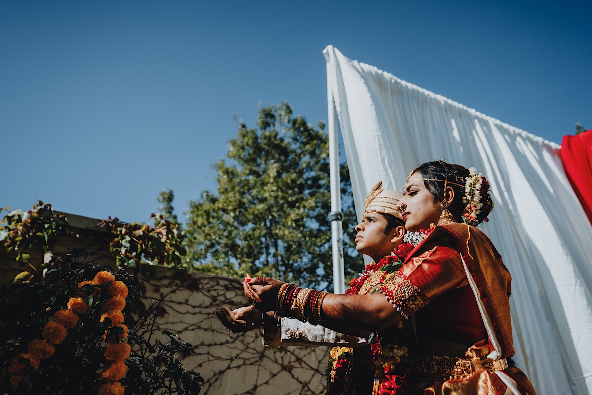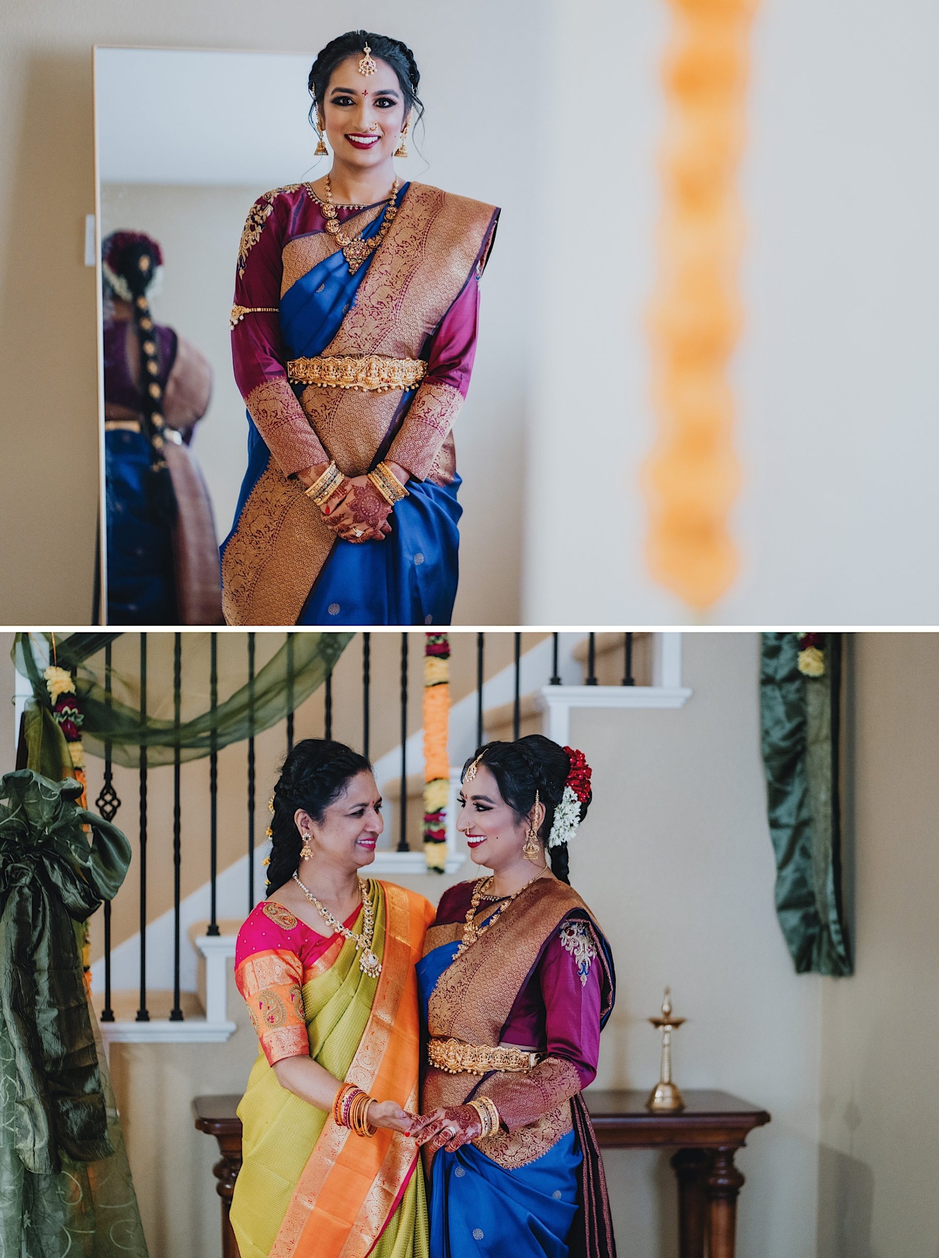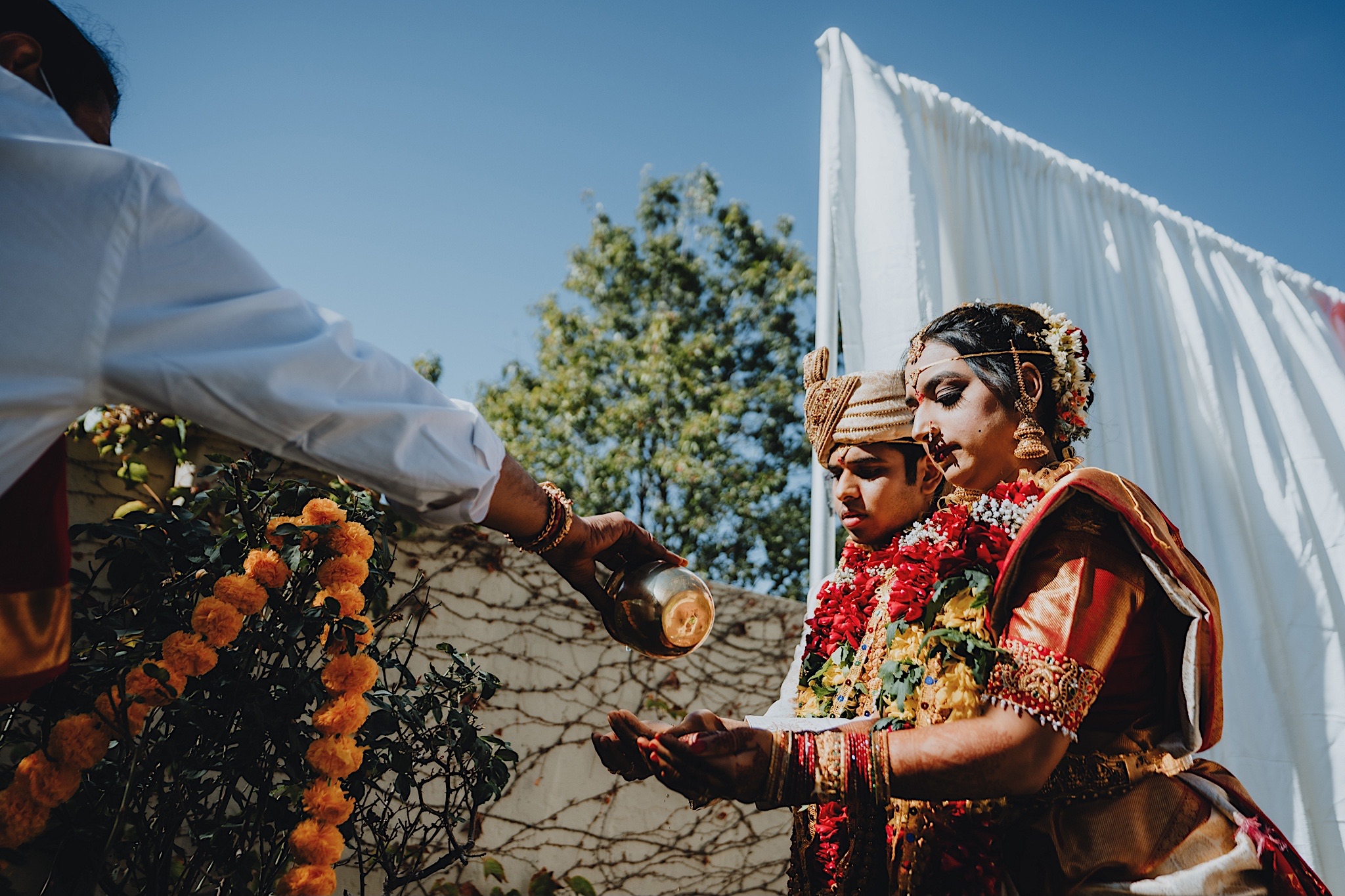 Shravya and Karthik had one such intimate South Indian Wedding in their backyard. It was a beautiful day for an Indian wedding and we started the day early in the morning just like most South Indian weddings. Shravya was already ready with beautiful hair and makeup and her South Indian Bridal saree before she would change into another saree early on in the ceremony. Their backyard was transformed into a wedding venue with beautiful decorations and Mandap.