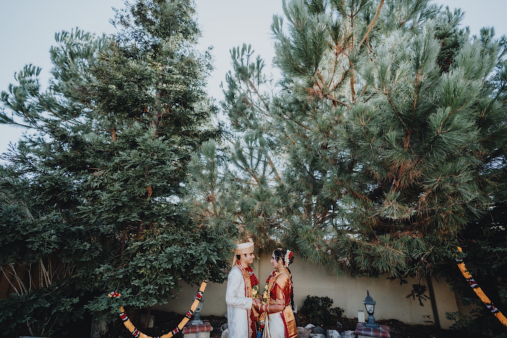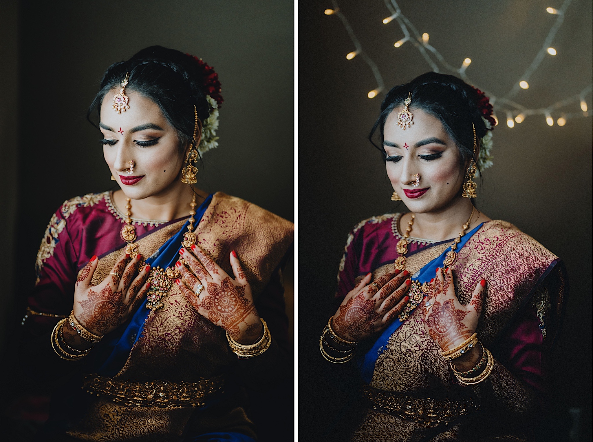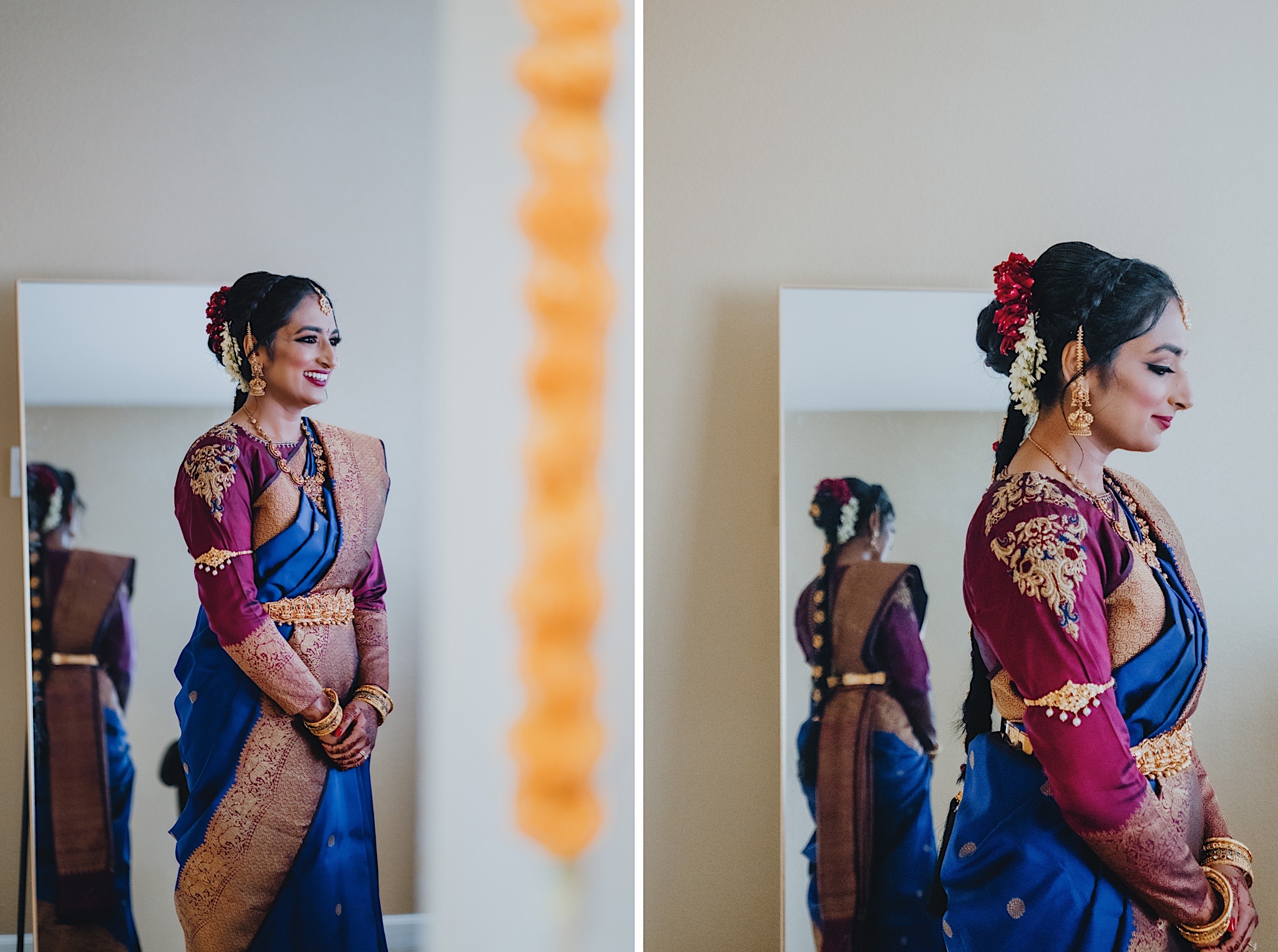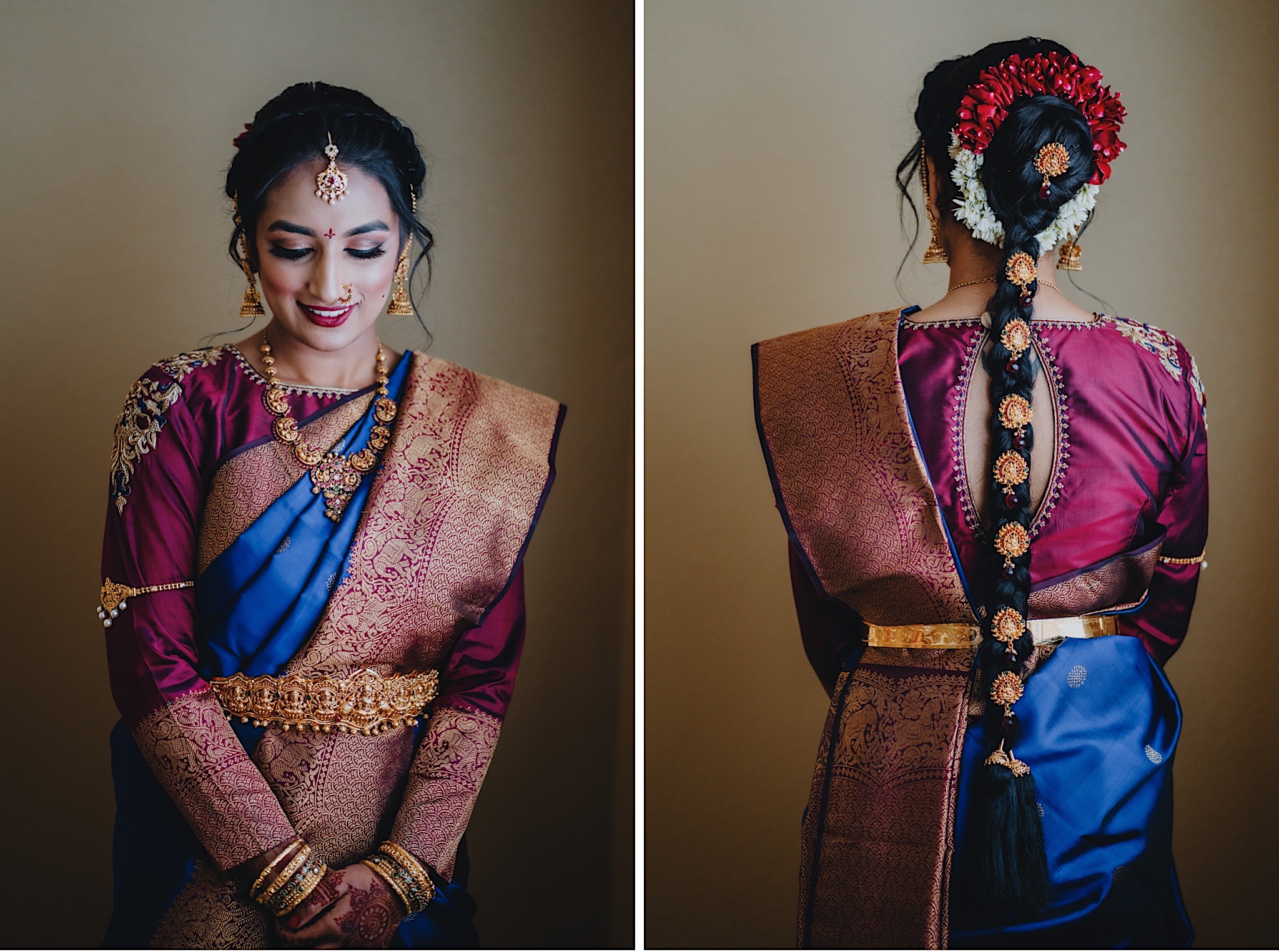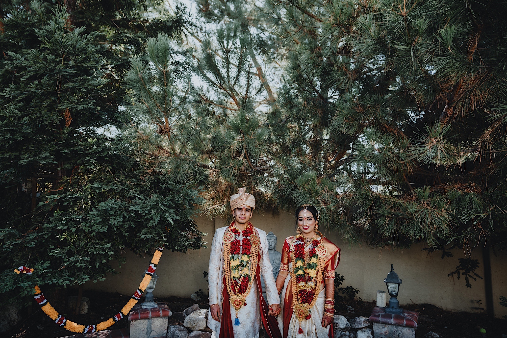 Shravya and Karthik had one such intimate South Indian Wedding in their backyard. It was a beautiful day for an Indian wedding and we started the day early in the morning just like most South Indian weddings. Shravya was already ready with beautiful hair and makeup and her South Indian Bridal saree before she would change into another saree early on in the ceremony. Their backyard was transformed into a wedding venue with beautiful decorations and Mandap.