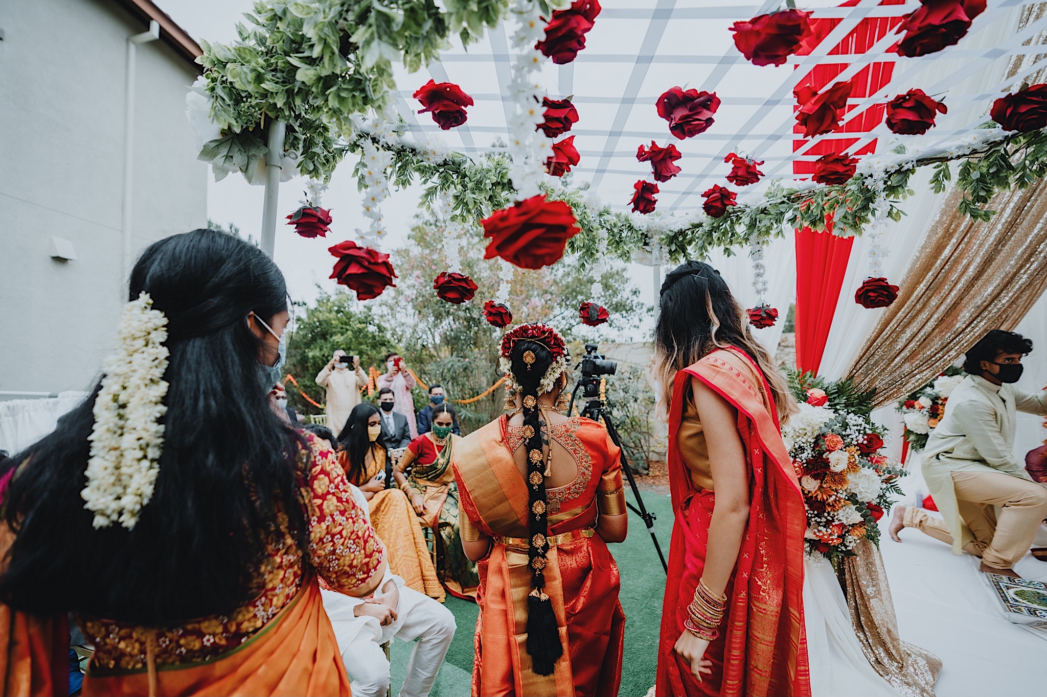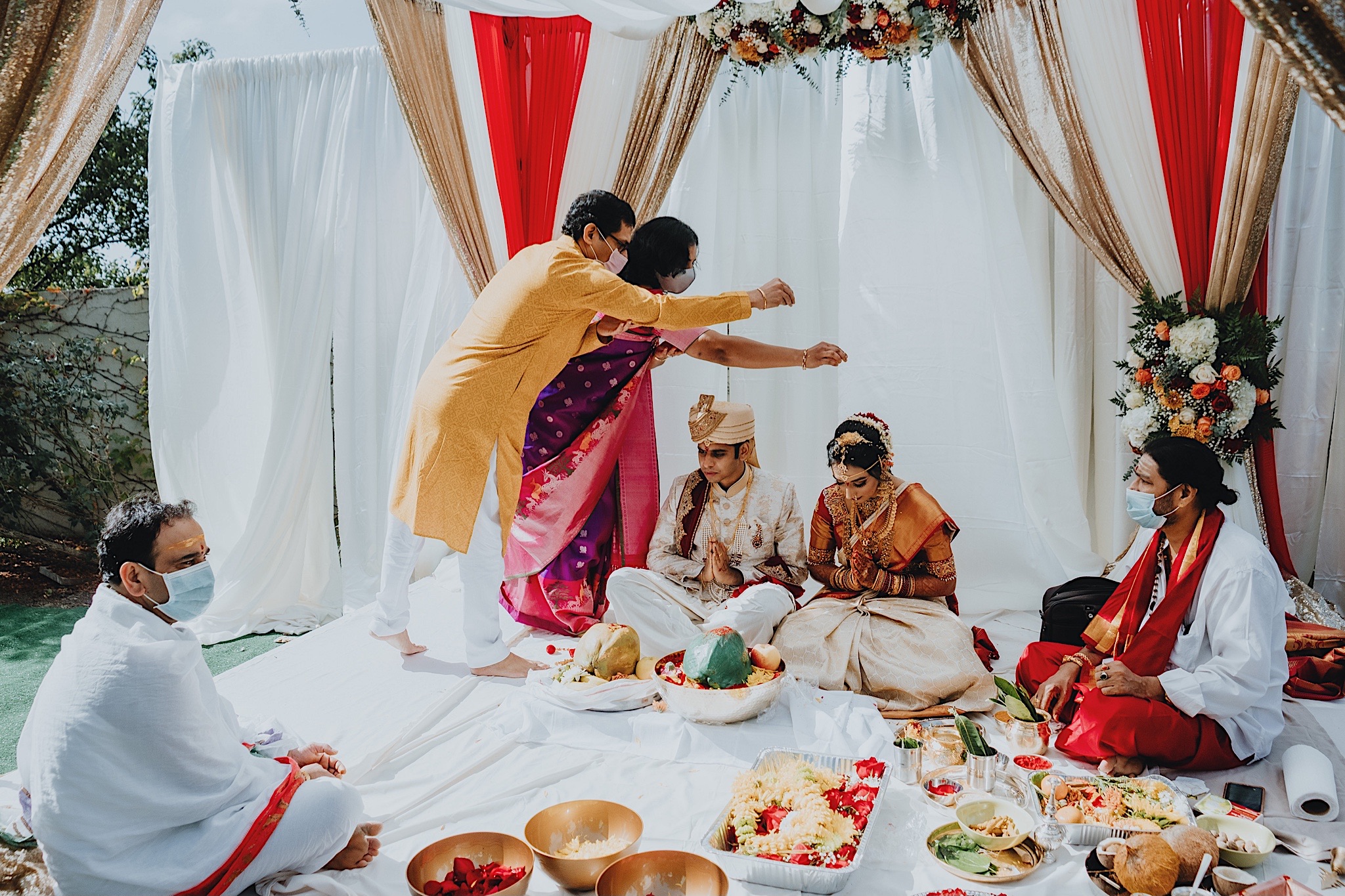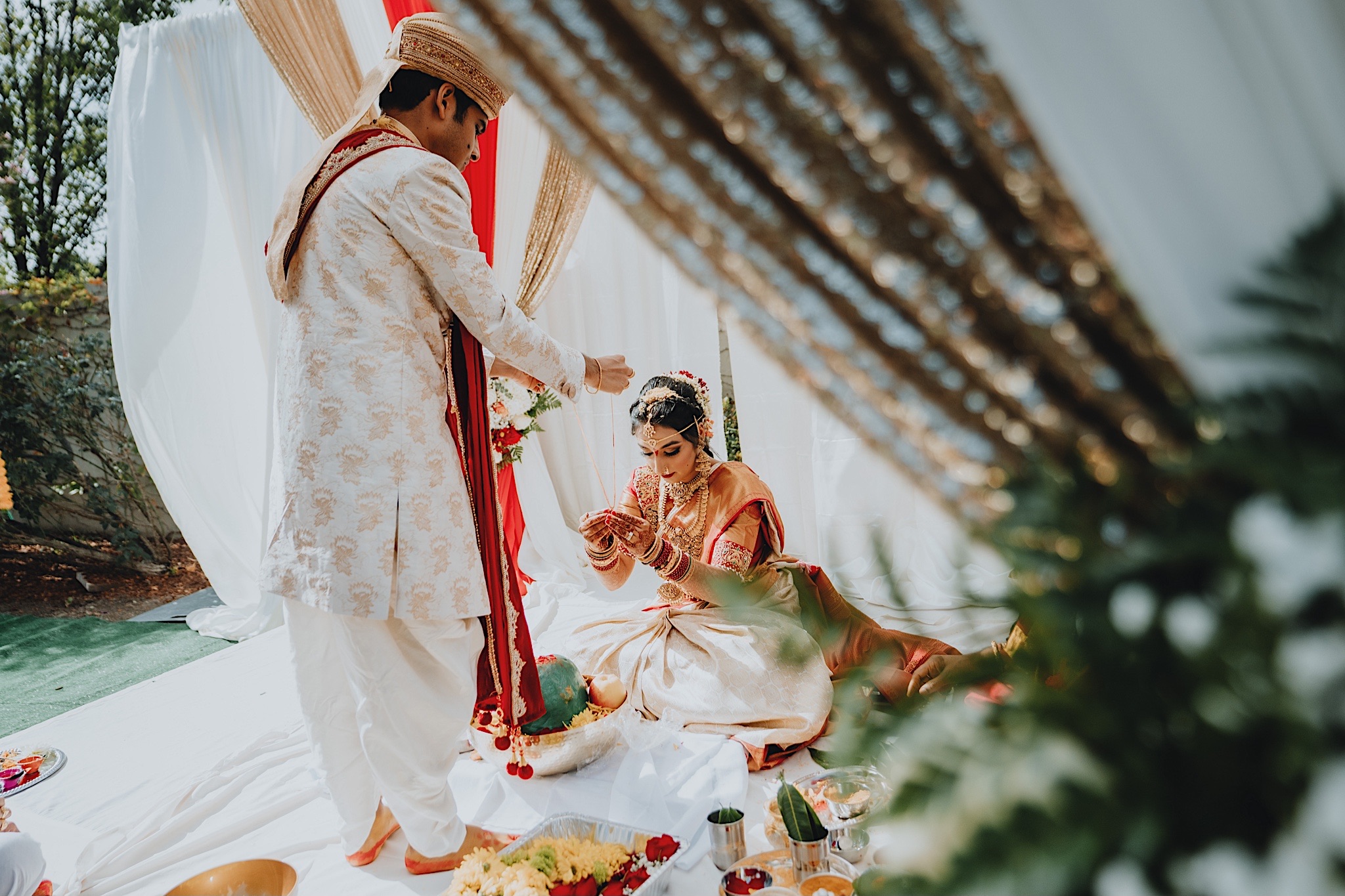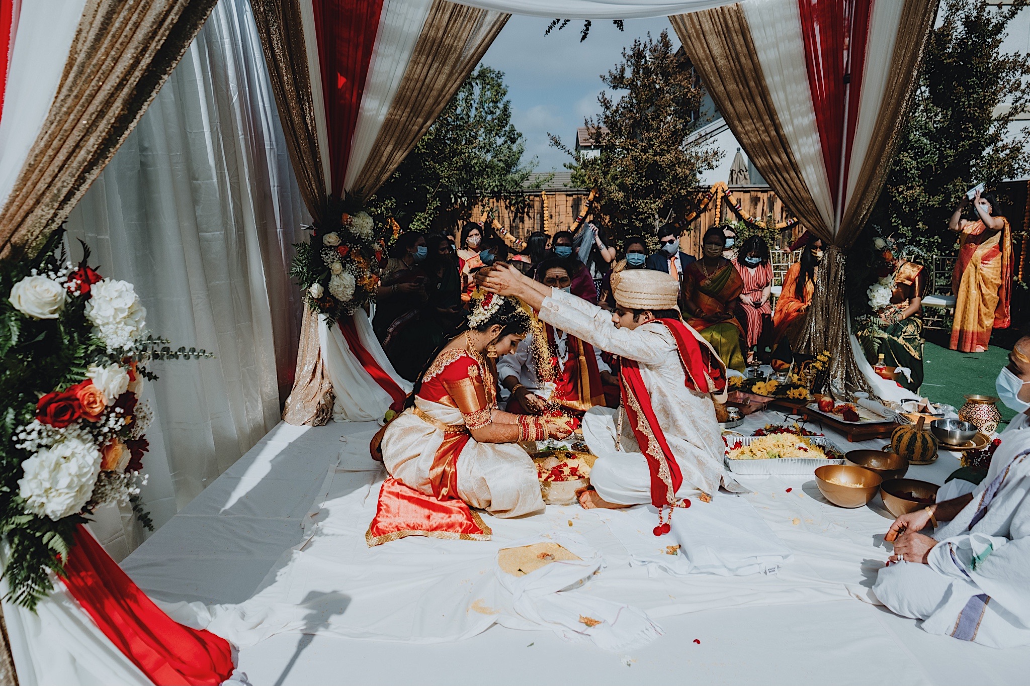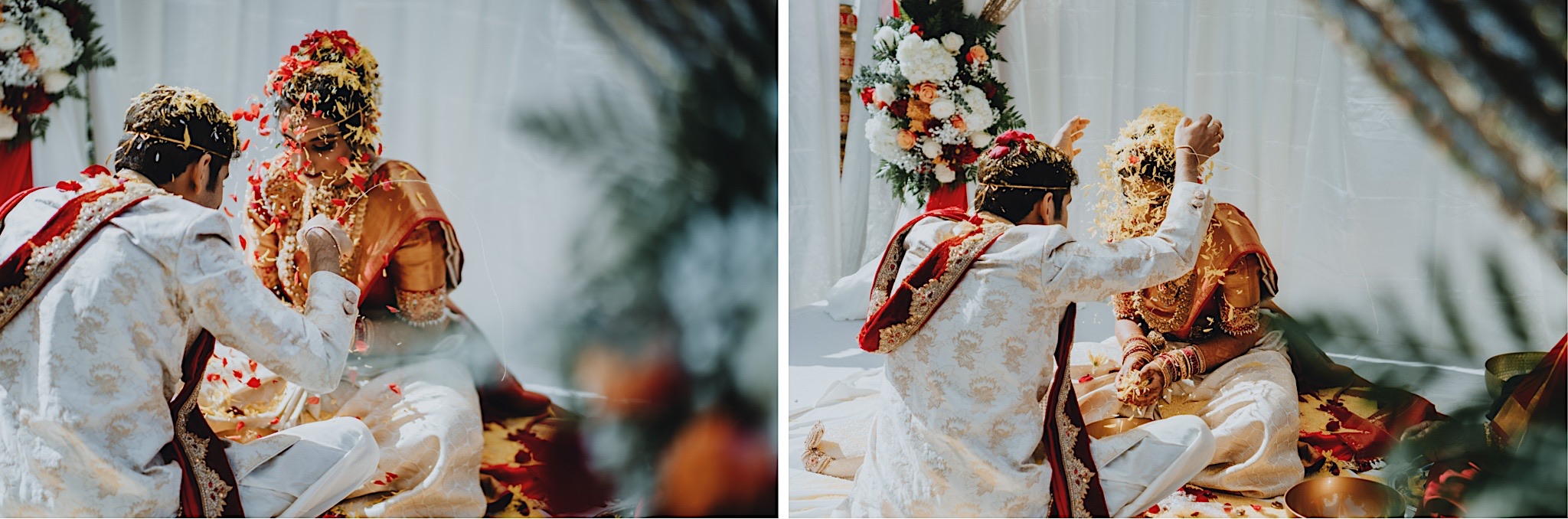 The bride had a beautiful floral canopy when she walked down the aisle for the ceremony. We got a variety of shots during the ceremony and when she changed into her second saree for the rest of the ceremony. Several different fun and emotional moments during the ceremony were captured both documentary style and artistic, candid style.