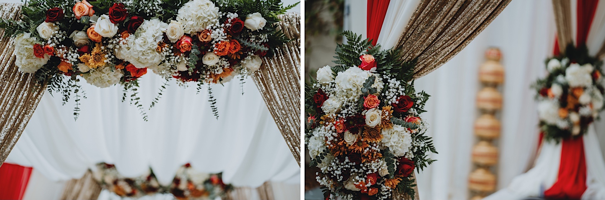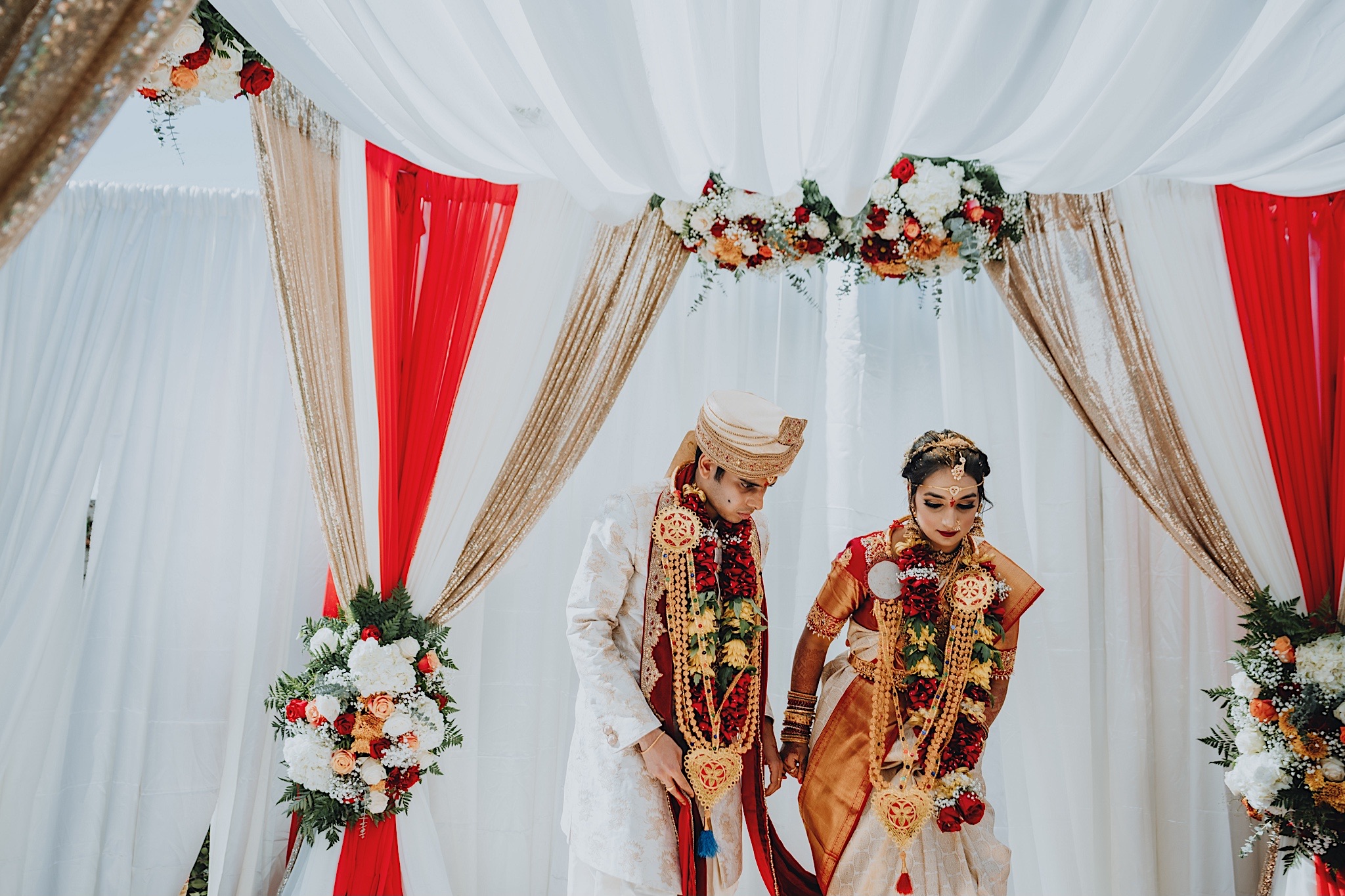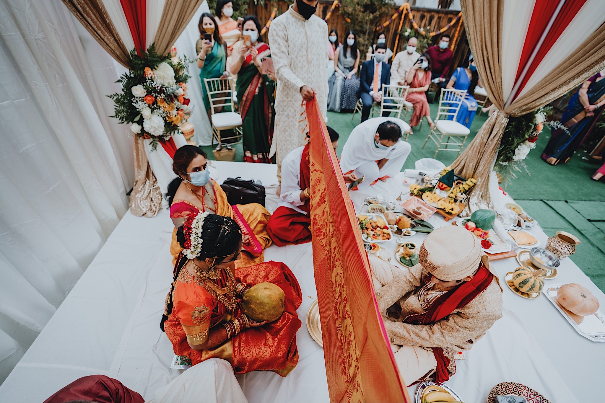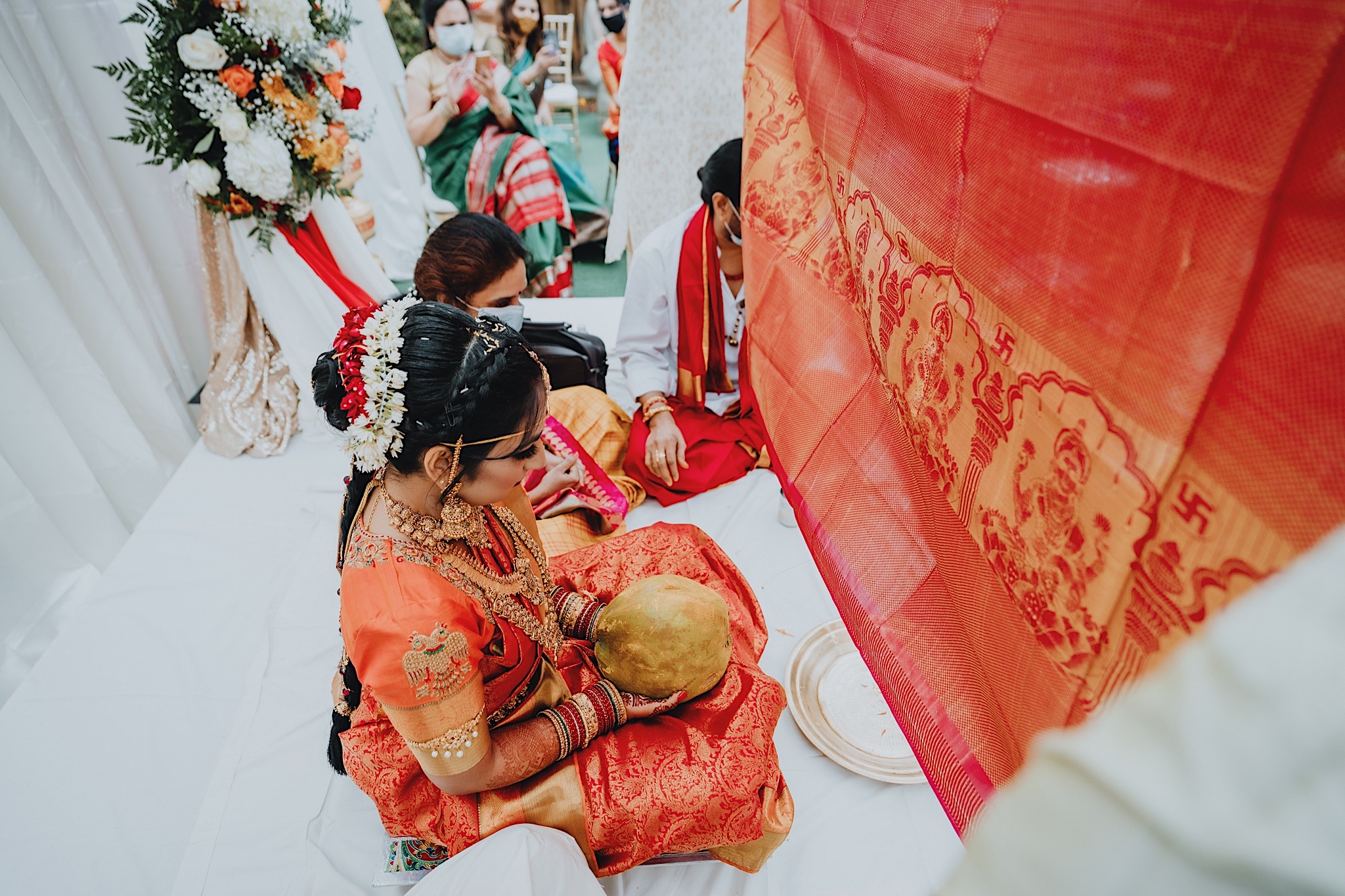 The bride had a beautiful floral canopy when she walked down the aisle for the ceremony. We got a variety of shots during the ceremony and when she changed into her second saree for the rest of the ceremony. Several different fun and emotional moments during the ceremony were captured both documentary style and artistic, candid style.