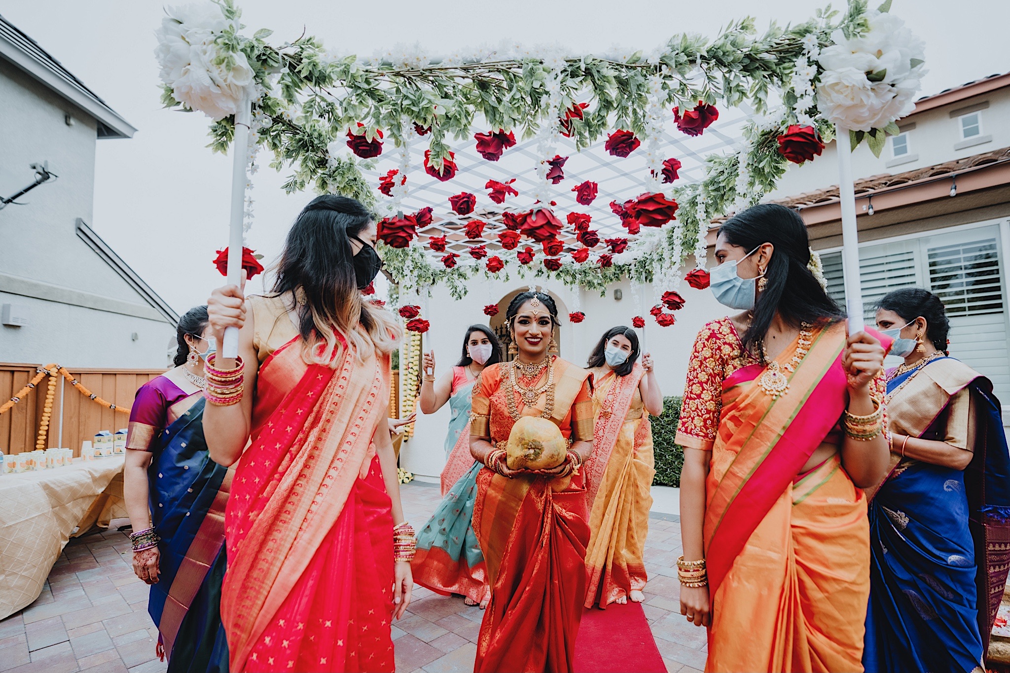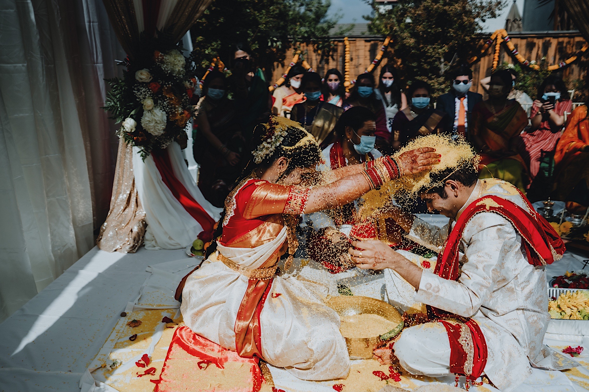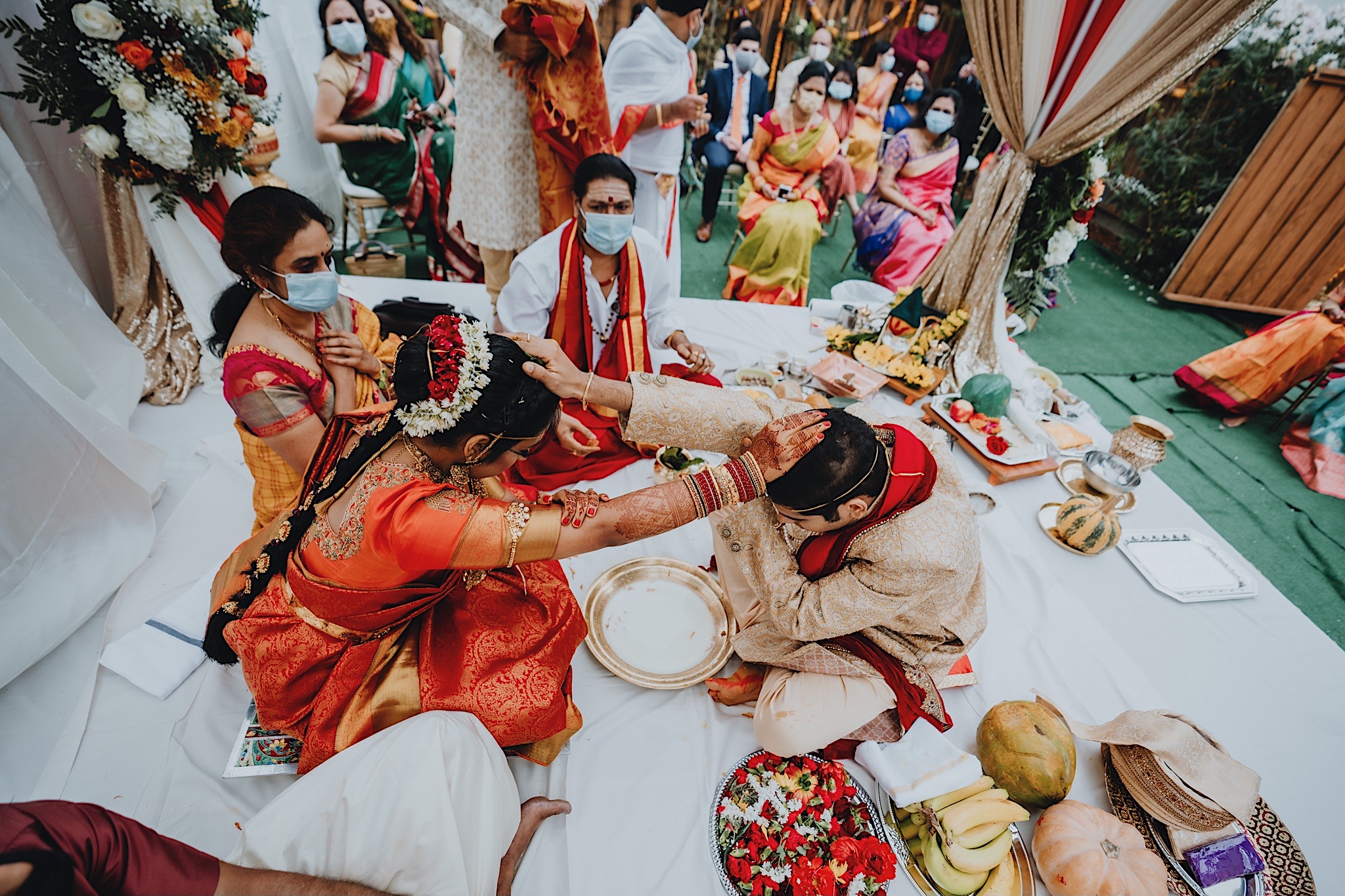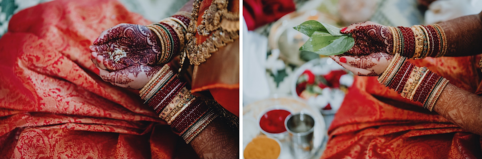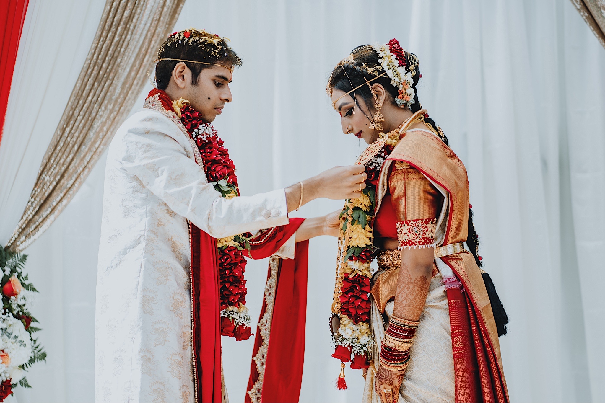 The bride had a beautiful floral canopy when she walked down the aisle for the ceremony. We got a variety of shots during the ceremony and when she changed into her second saree for the rest of the ceremony. Several different fun and emotional moments during the ceremony were captured both documentary style and artistic, candid style.
