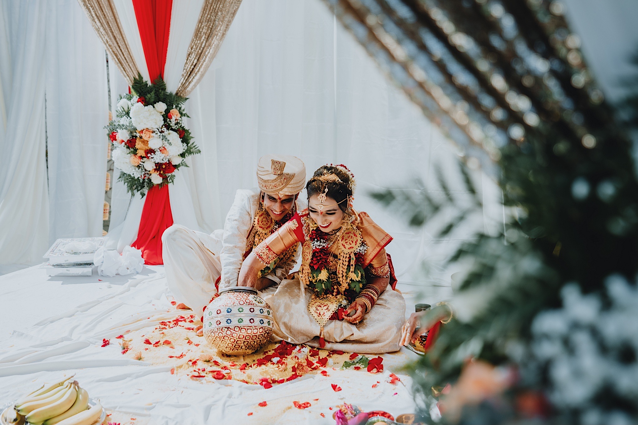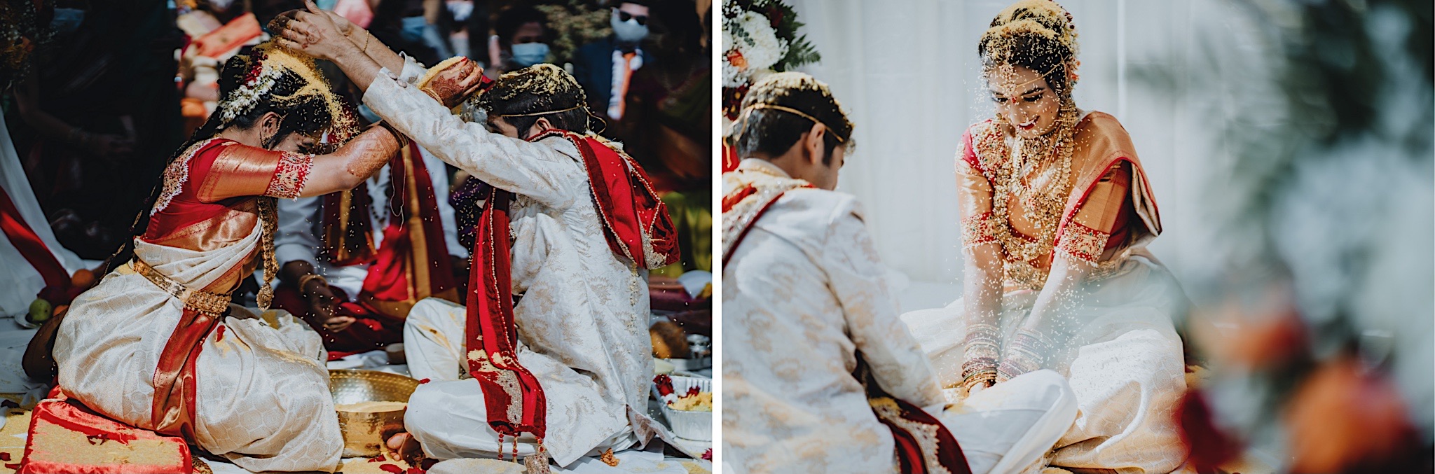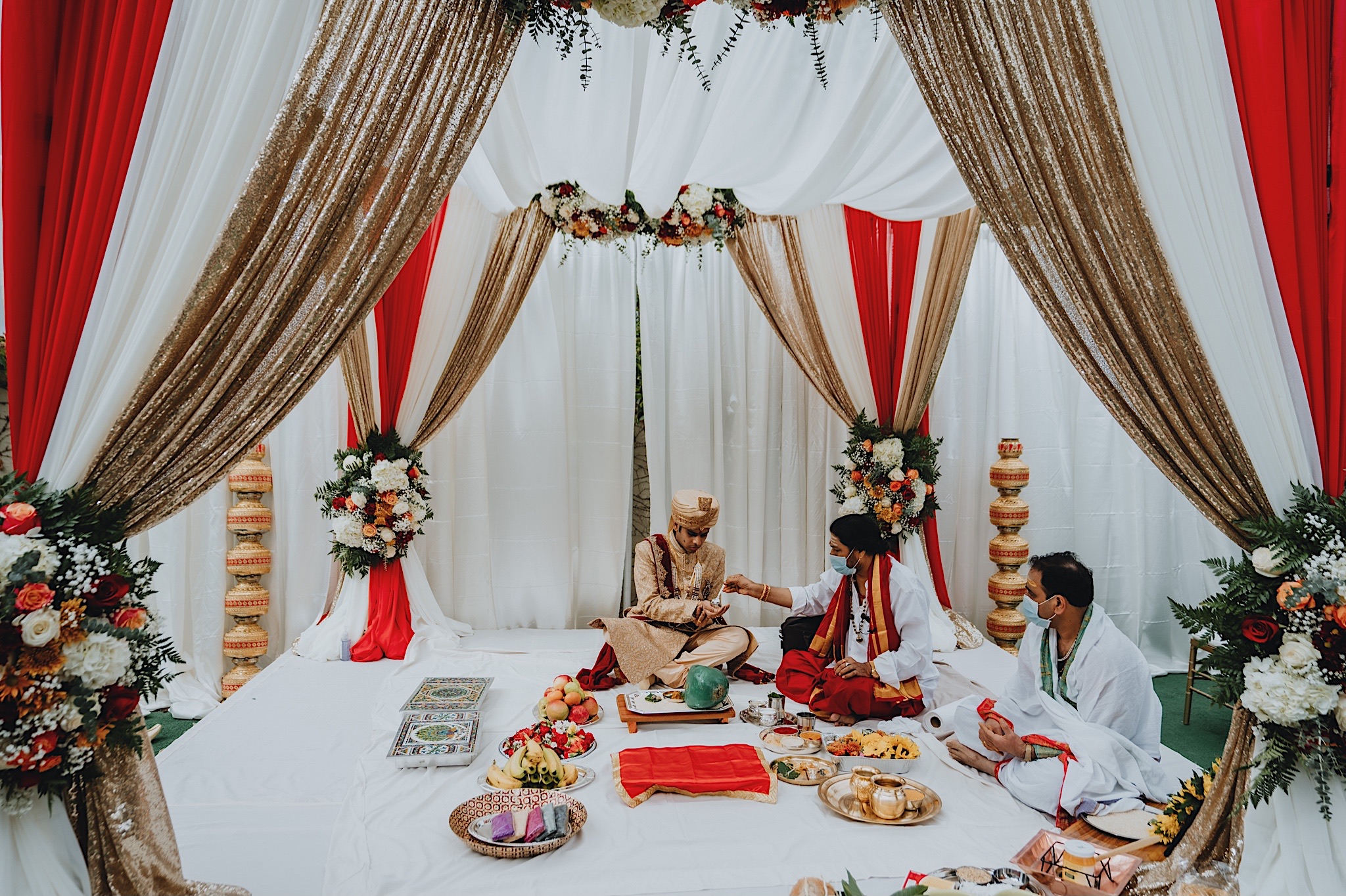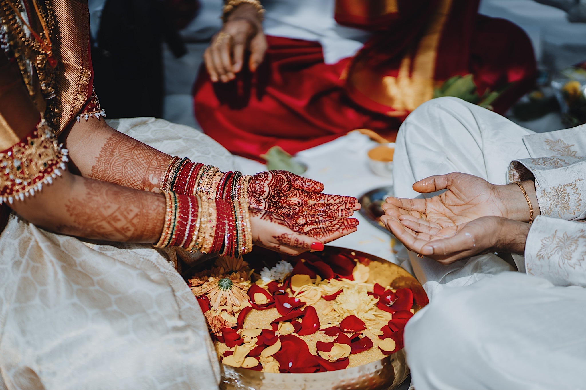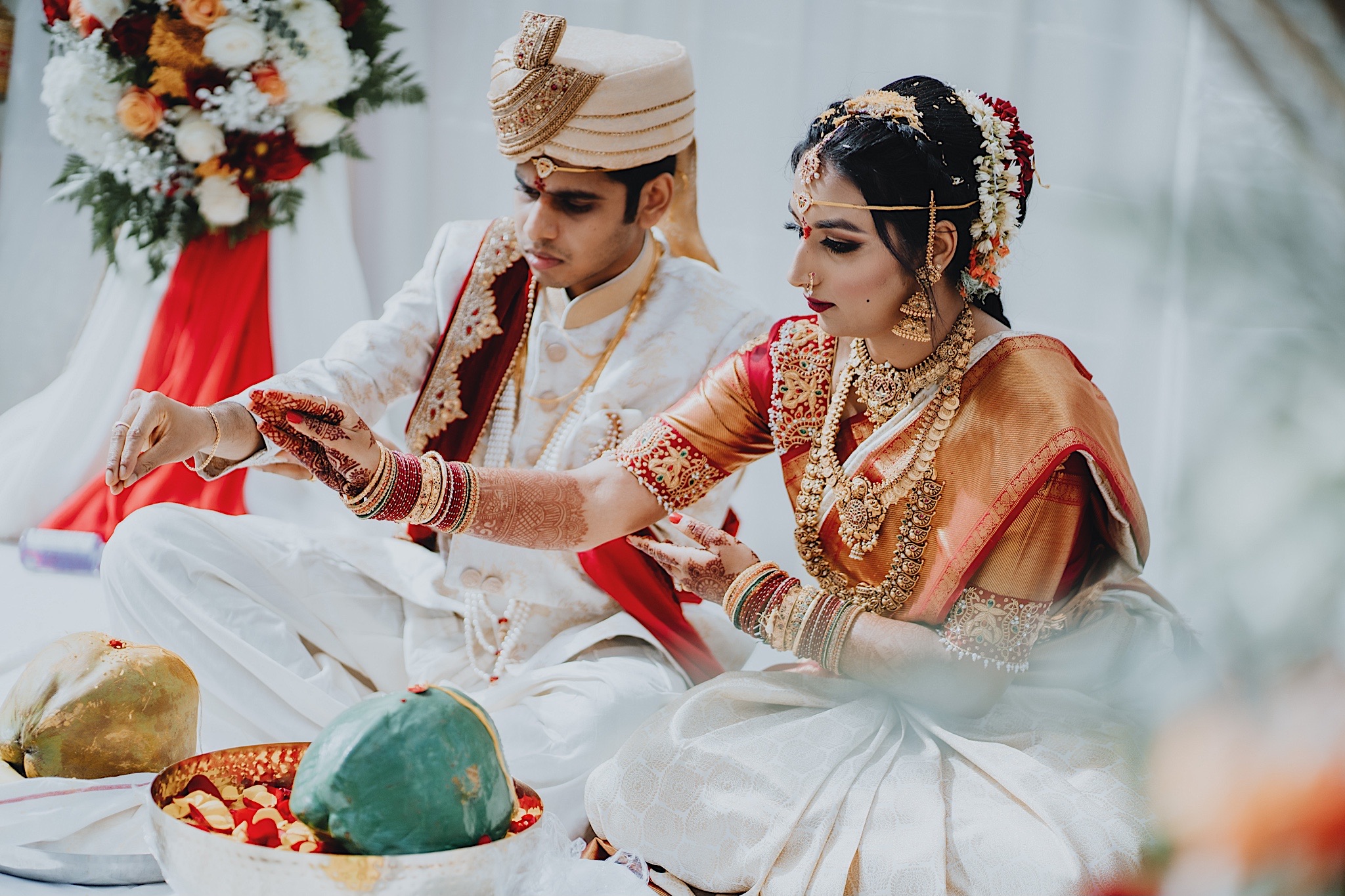 The bride had a beautiful floral canopy when she walked down the aisle for the ceremony. We got a variety of shots during the ceremony and when she changed into her second saree for the rest of the ceremony. Several different fun and emotional moments during the ceremony were captured both documentary style and artistic, candid style.