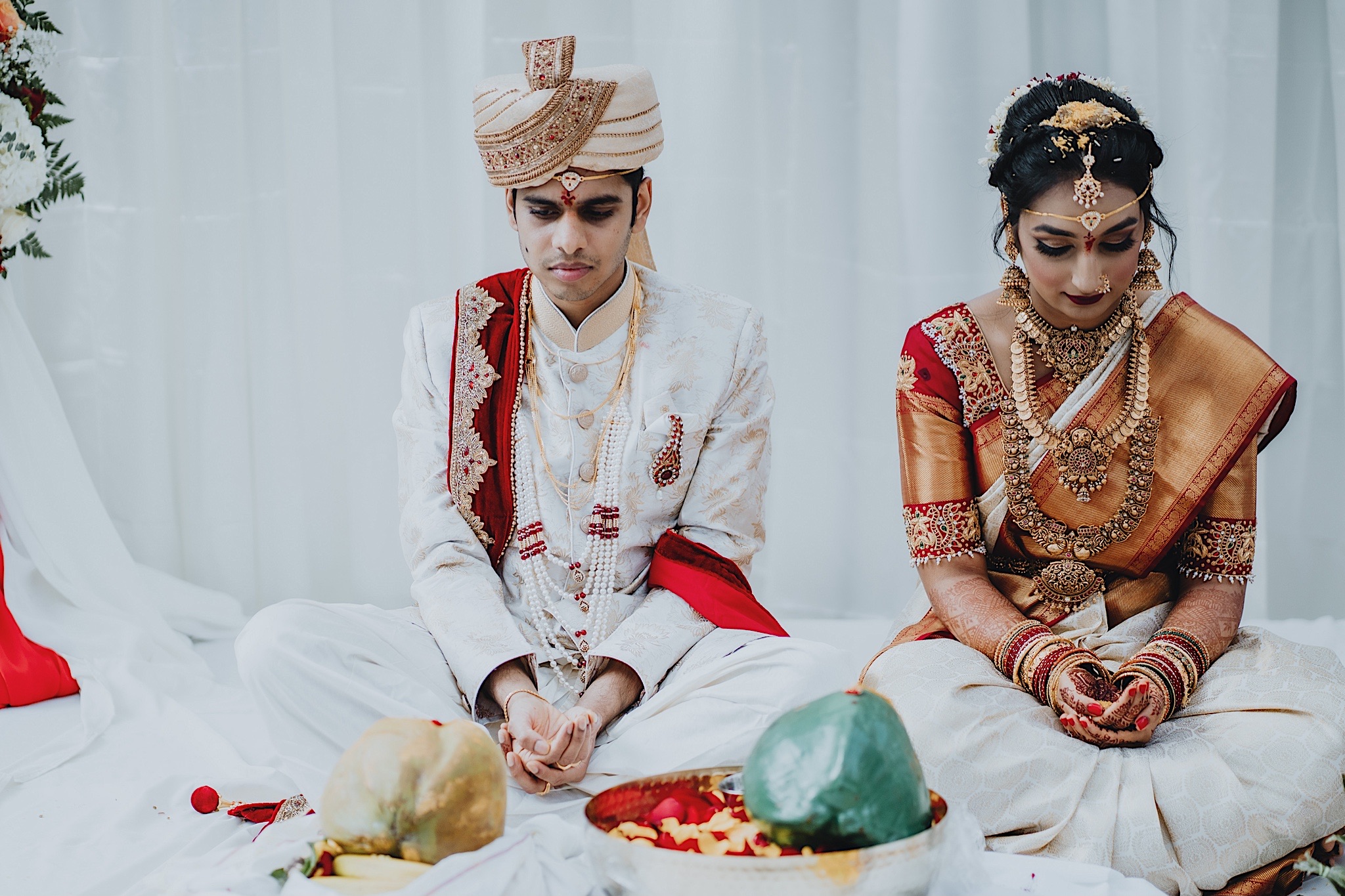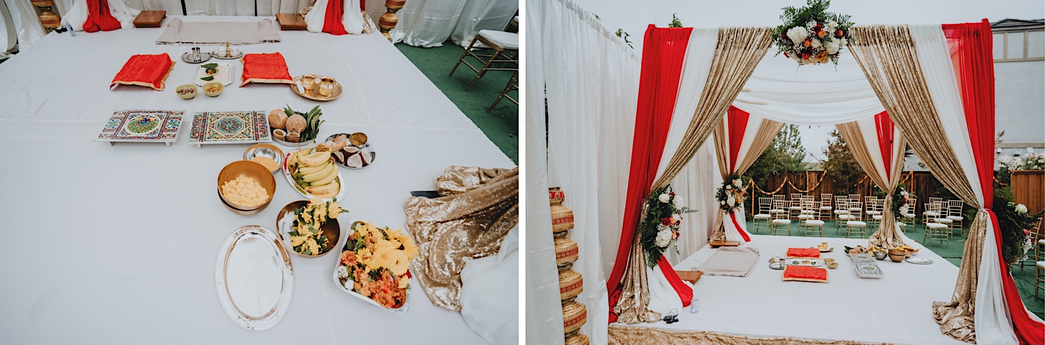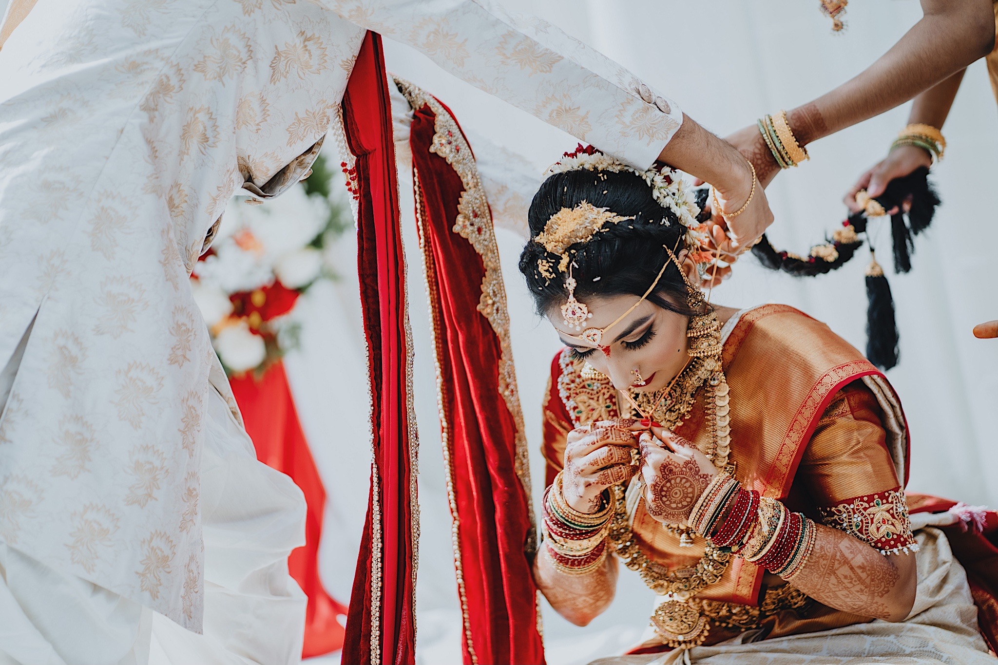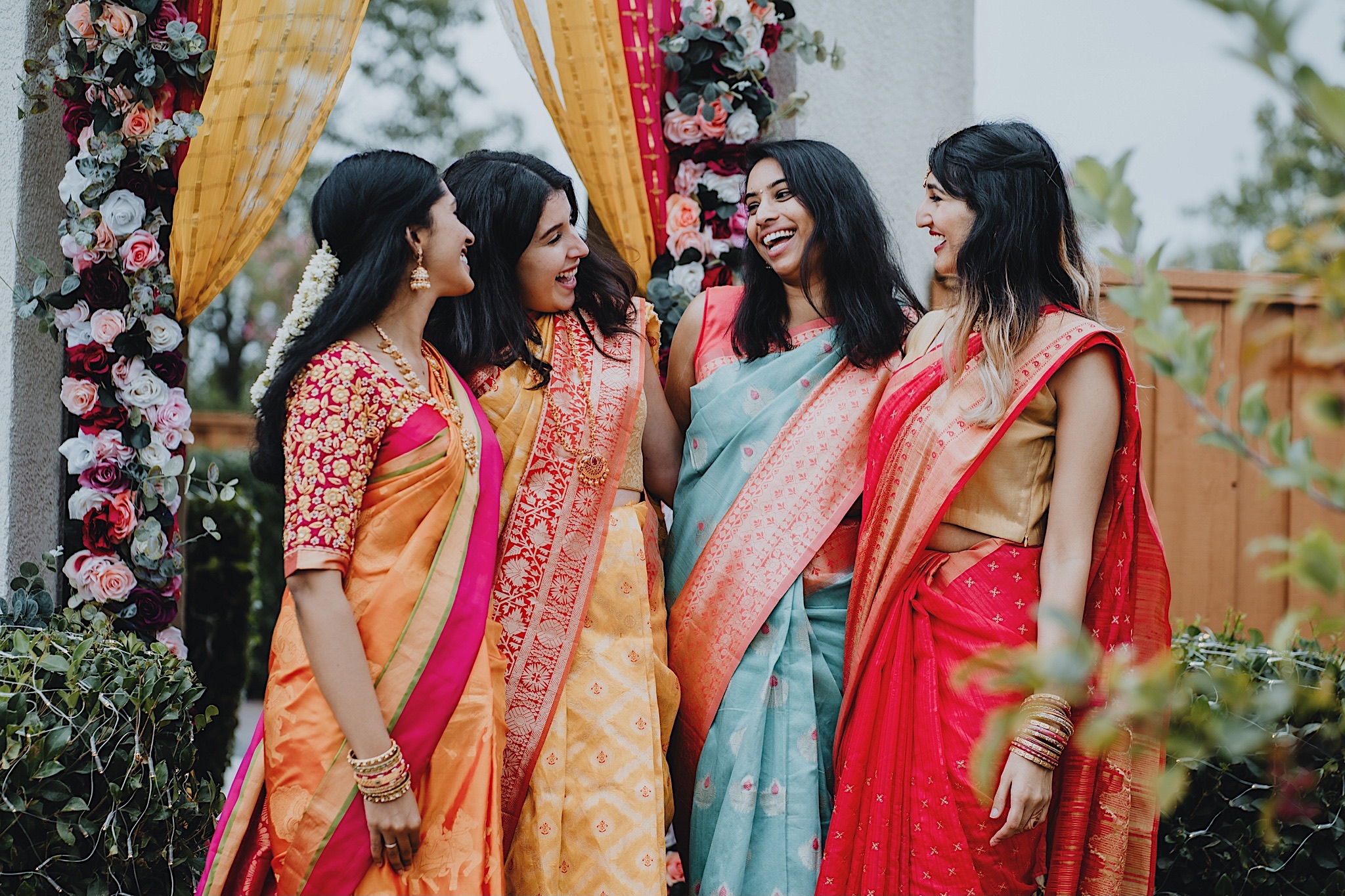 The bride had a beautiful floral canopy when she walked down the aisle for the ceremony. We got a variety of shots during the ceremony and when she changed into her second saree for the rest of the ceremony. Several different fun and emotional moments during the ceremony were captured both documentary style and artistic, candid style.