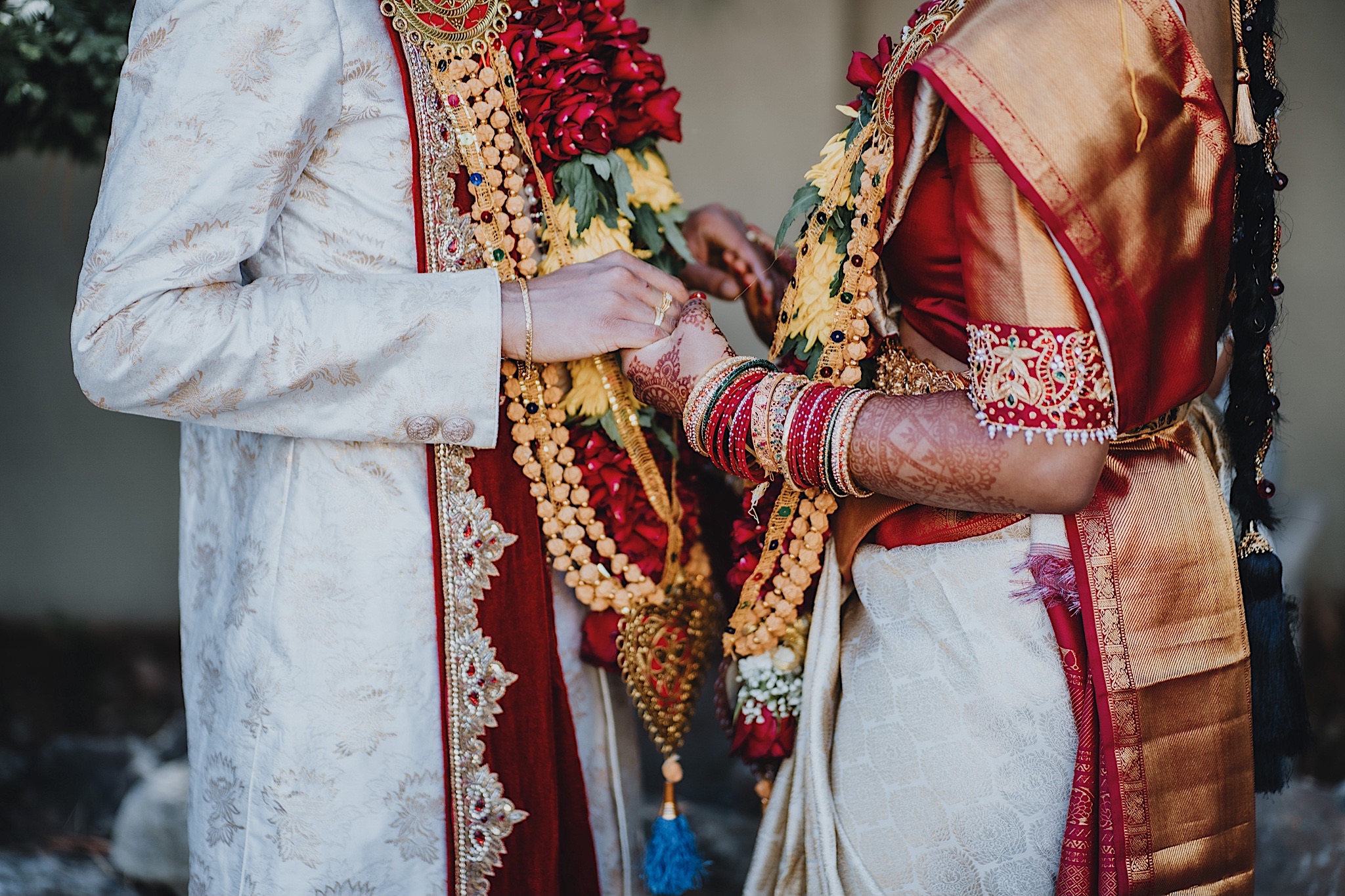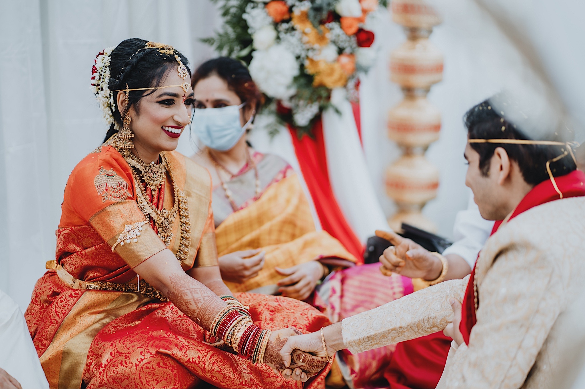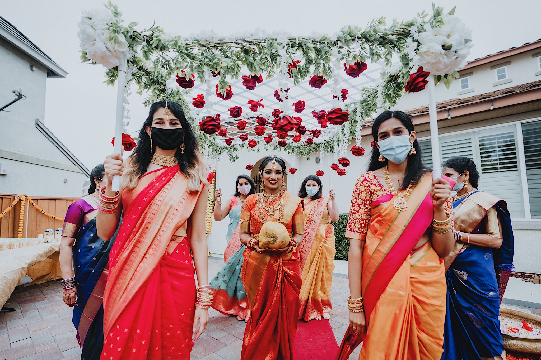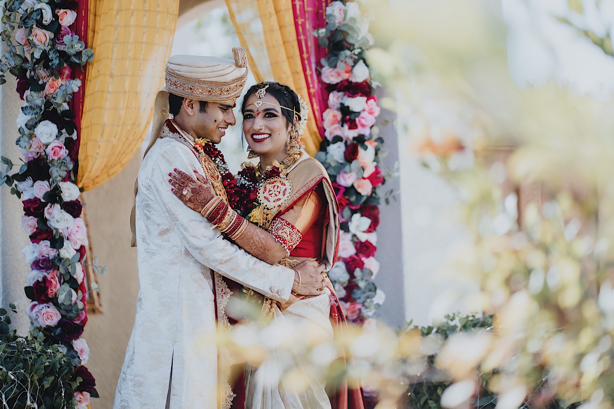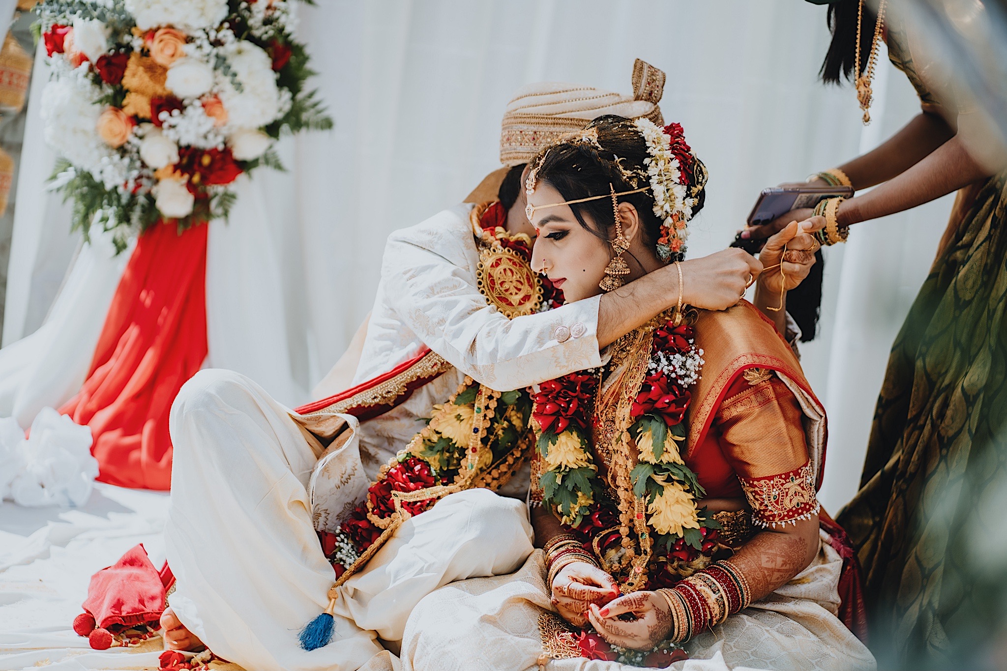 The bride had a beautiful floral canopy when she walked down the aisle for the ceremony. We got a variety of shots during the ceremony and when she changed into her second saree for the rest of the ceremony. Several different fun and emotional moments during the ceremony were captured both documentary style and artistic, candid style.