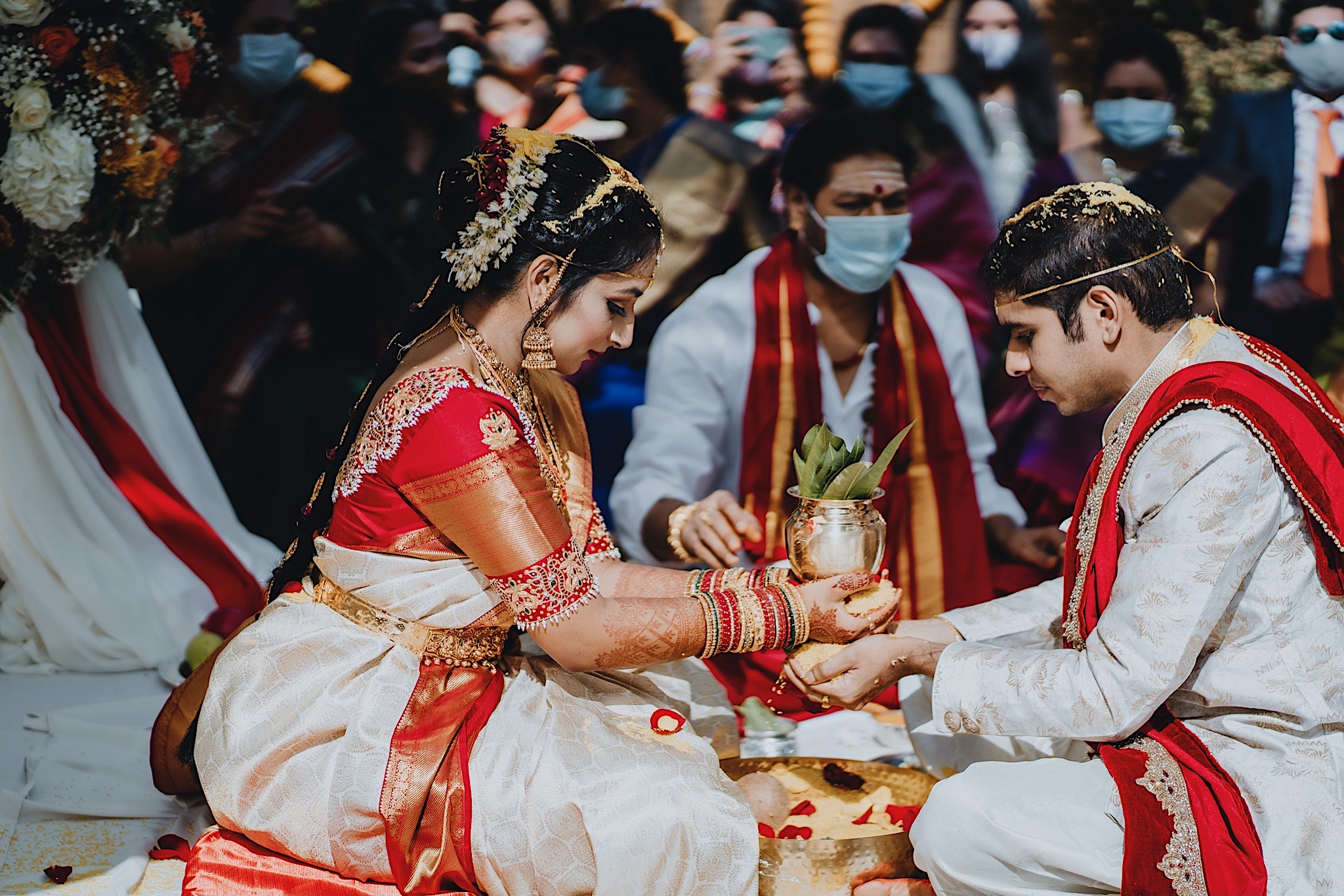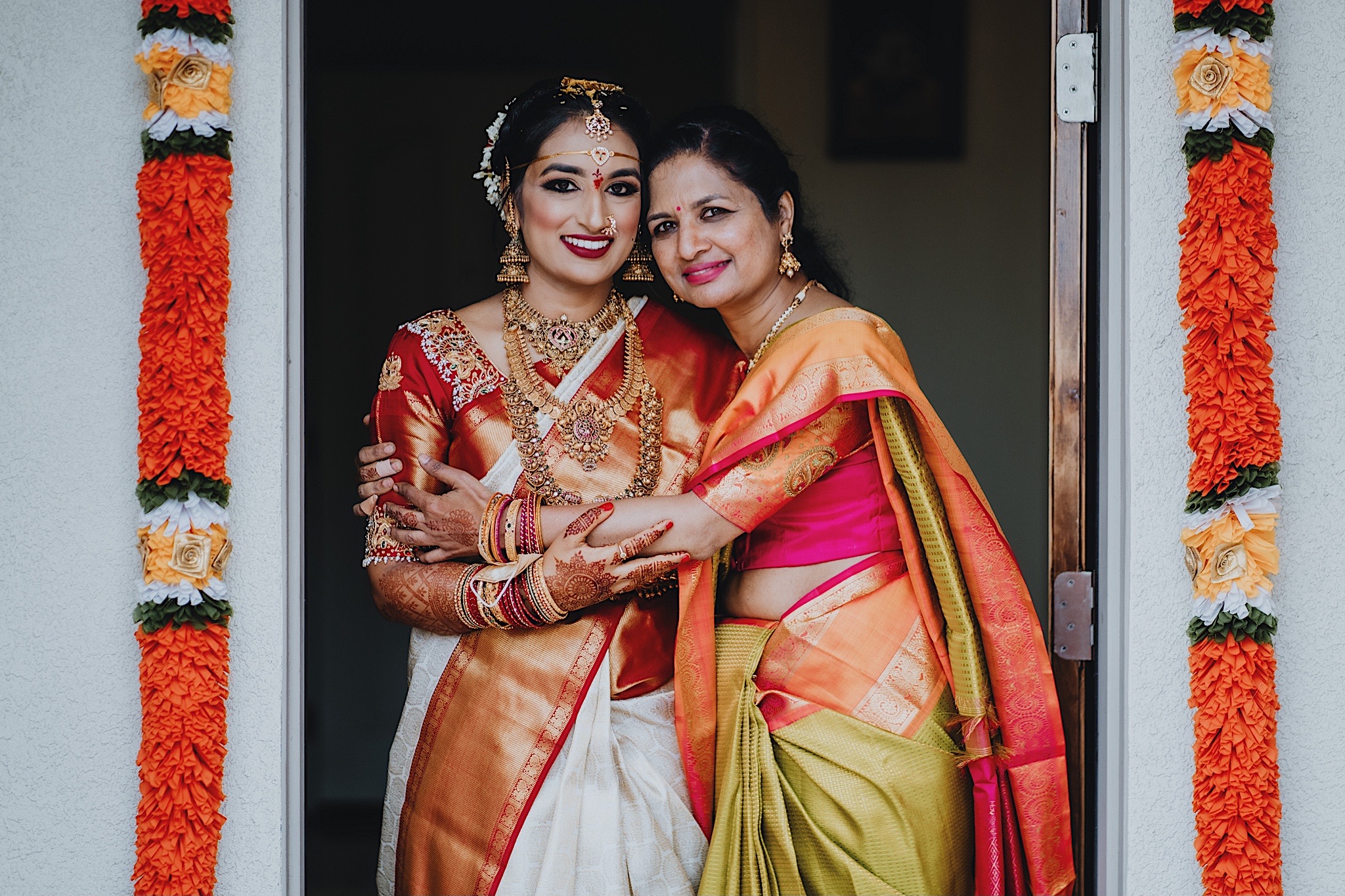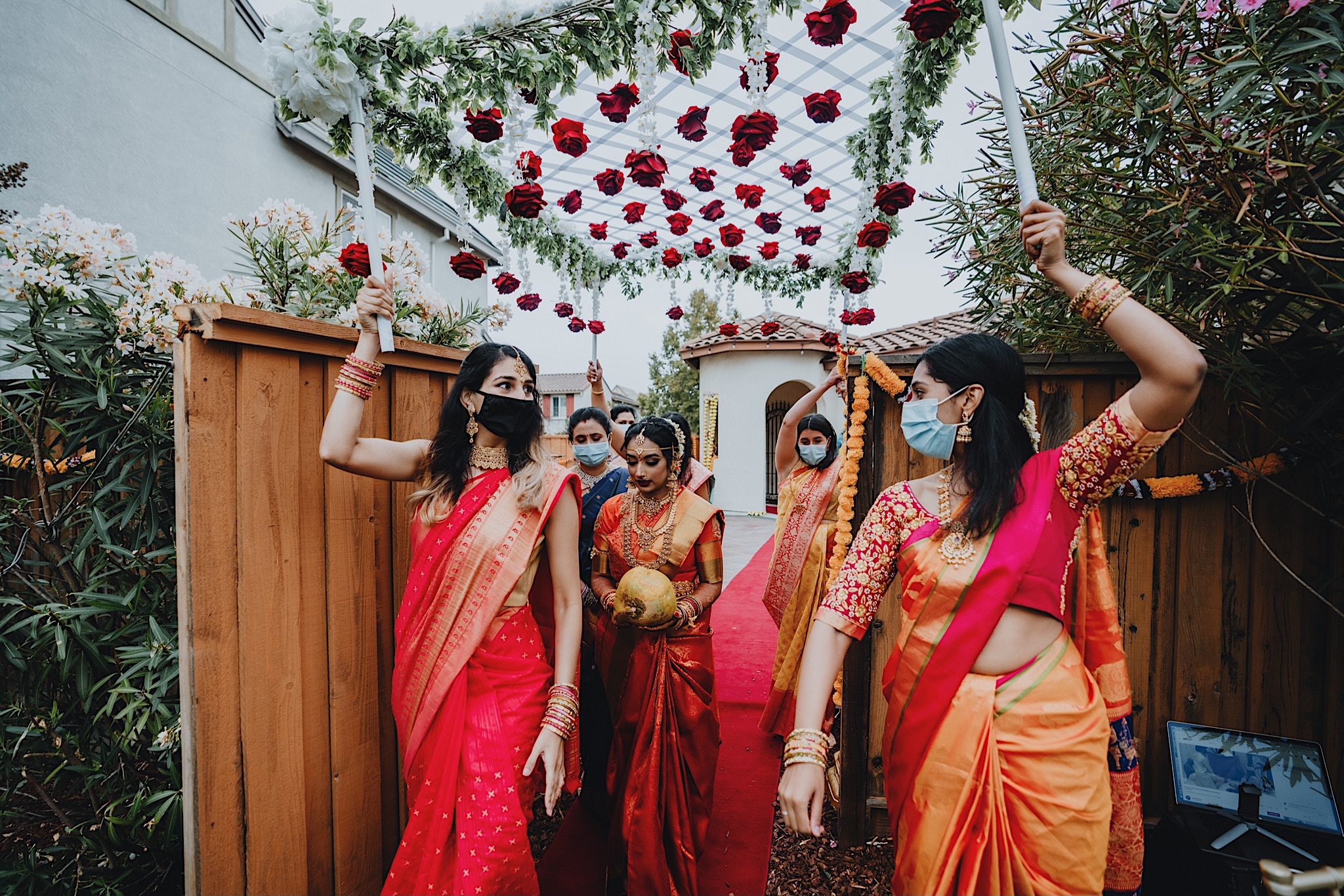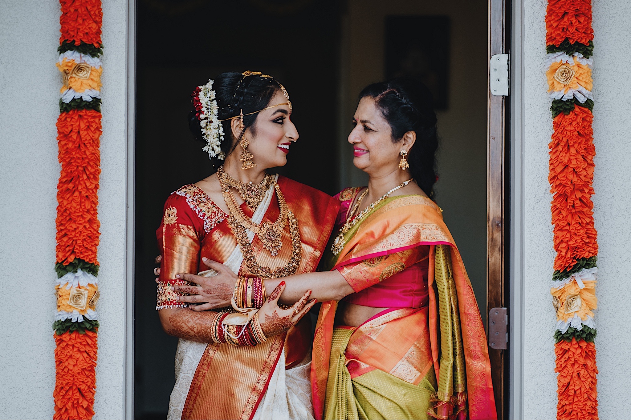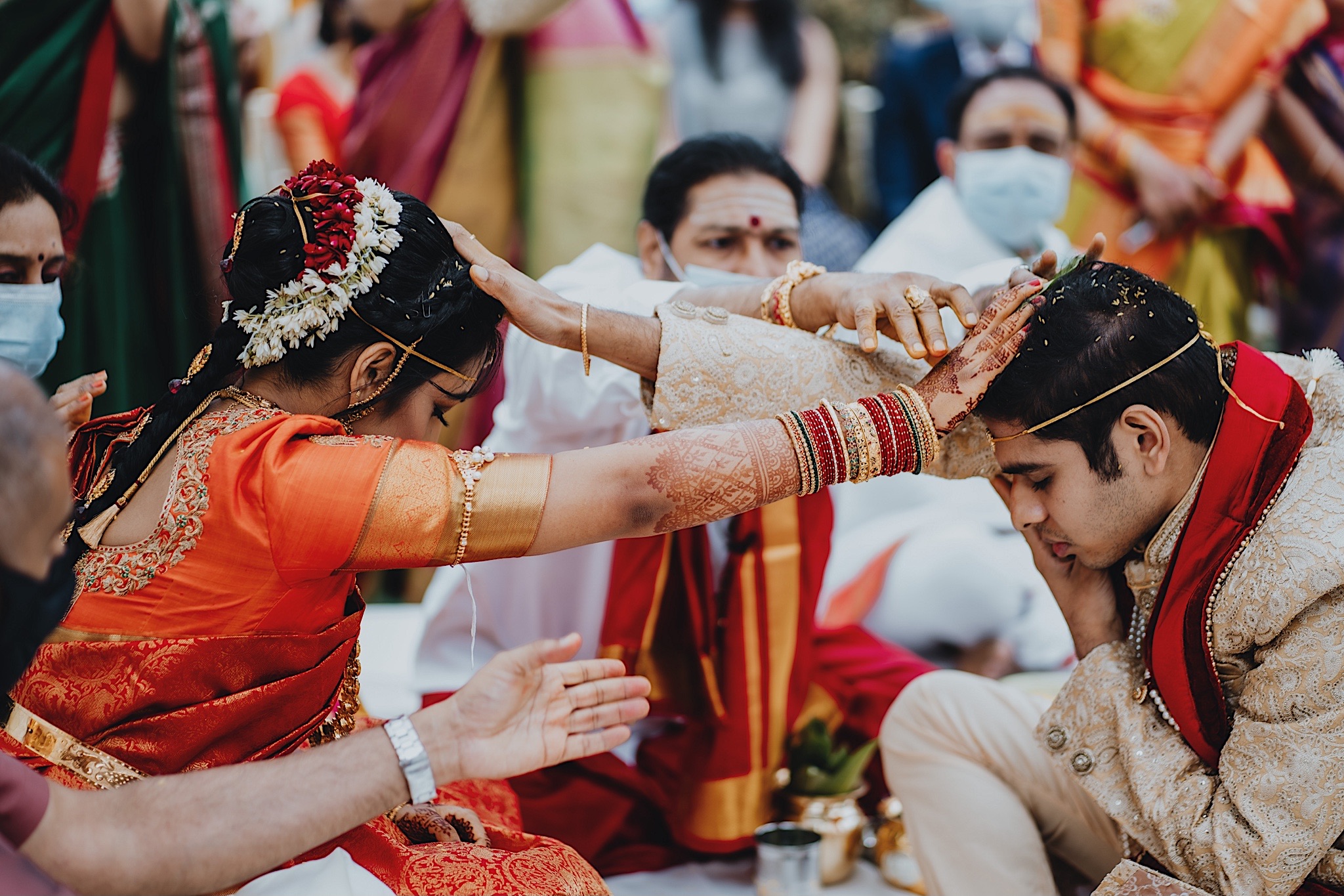 The bride had a beautiful floral canopy when she walked down the aisle for the ceremony. We got a variety of shots during the ceremony and when she changed into her second saree for the rest of the ceremony. Several different fun and emotional moments during the ceremony were captured both documentary style and artistic, candid style.