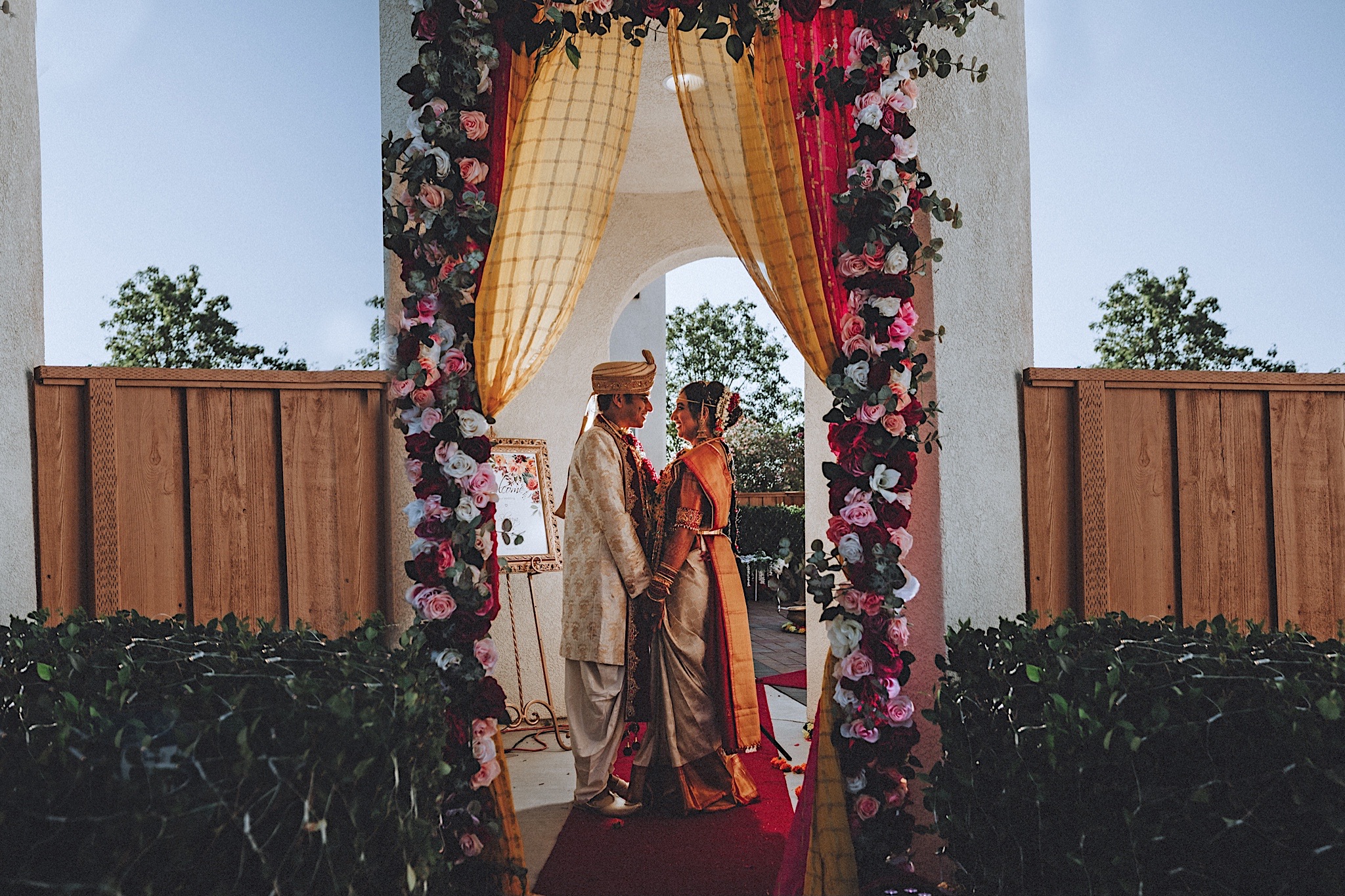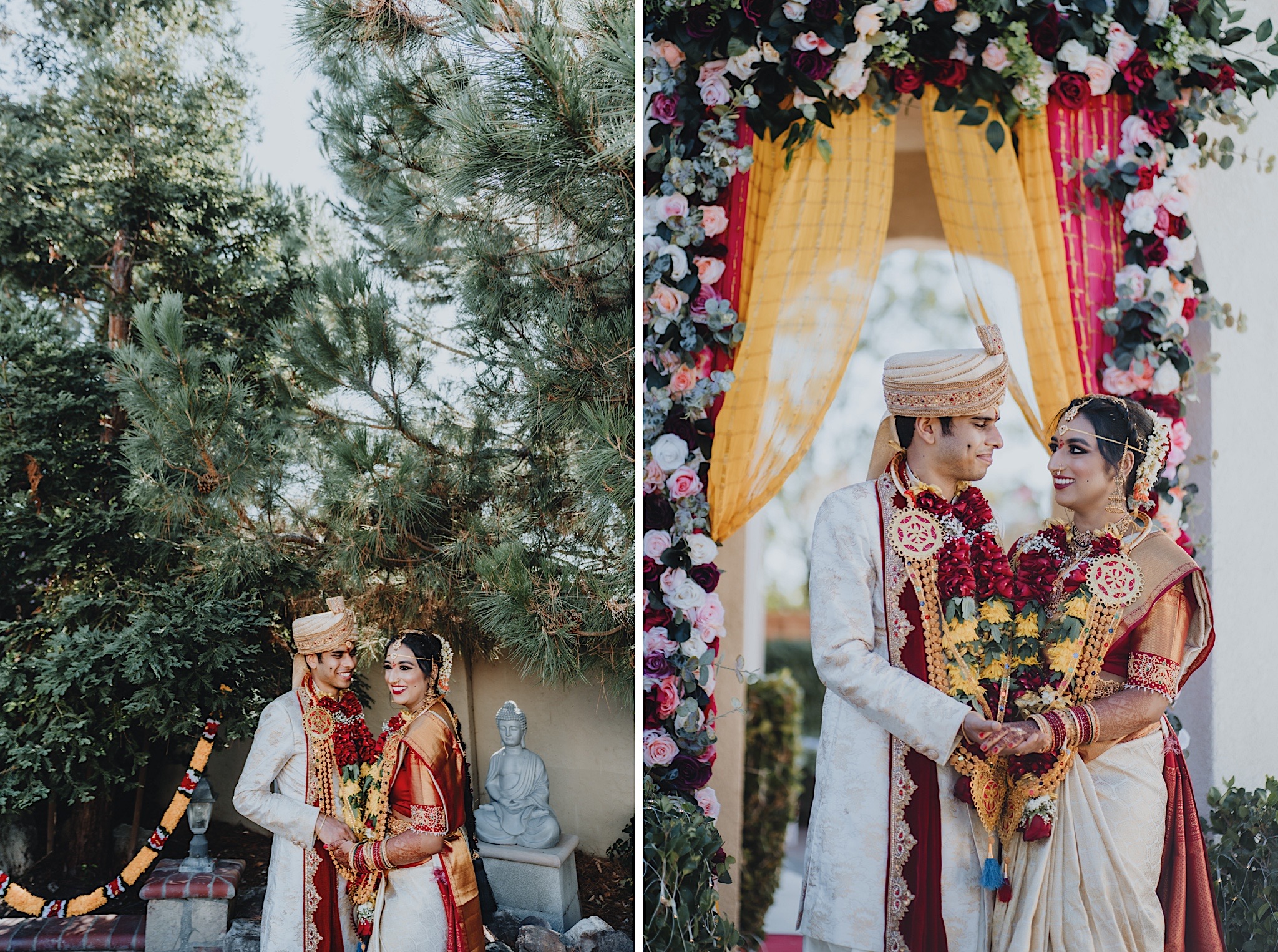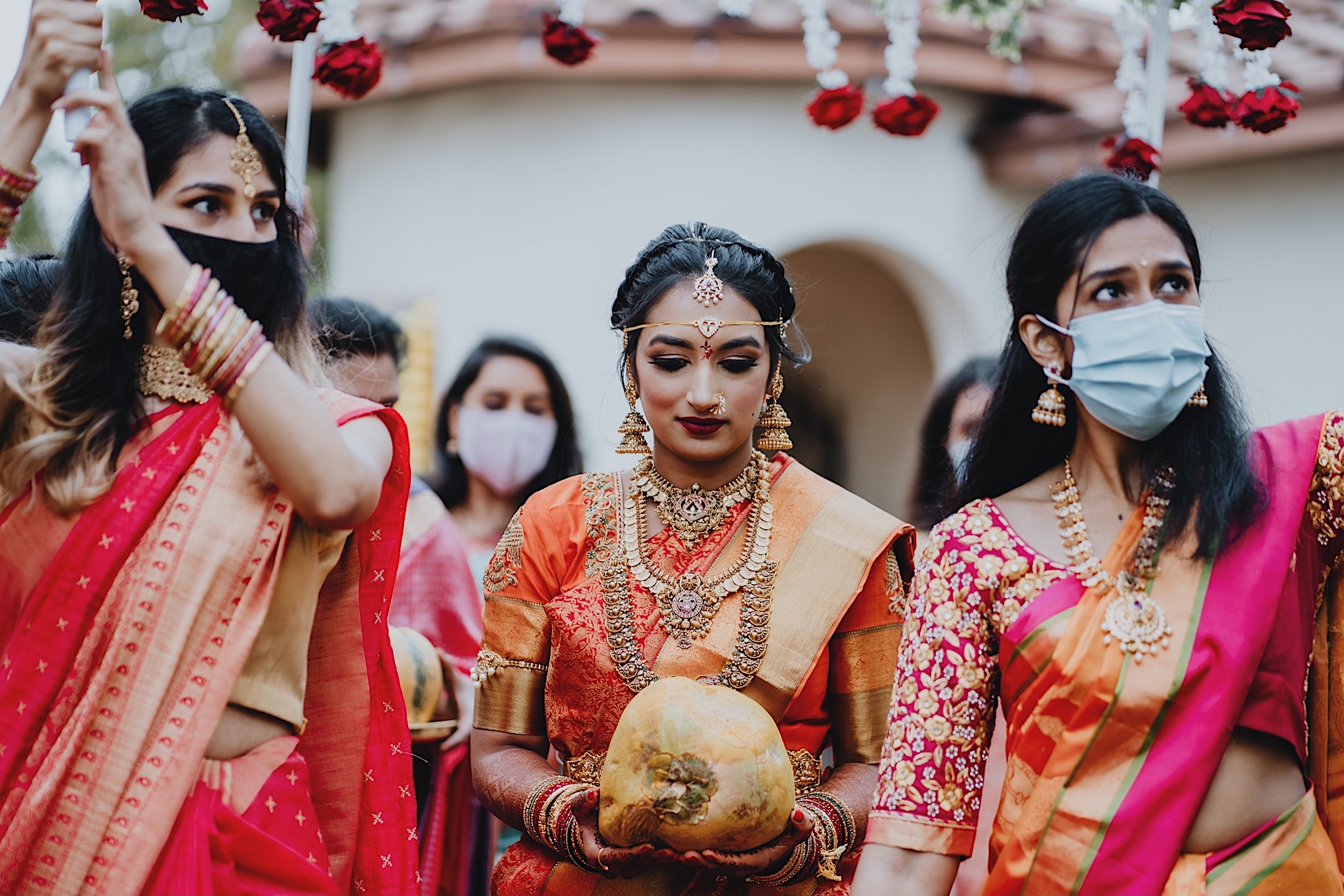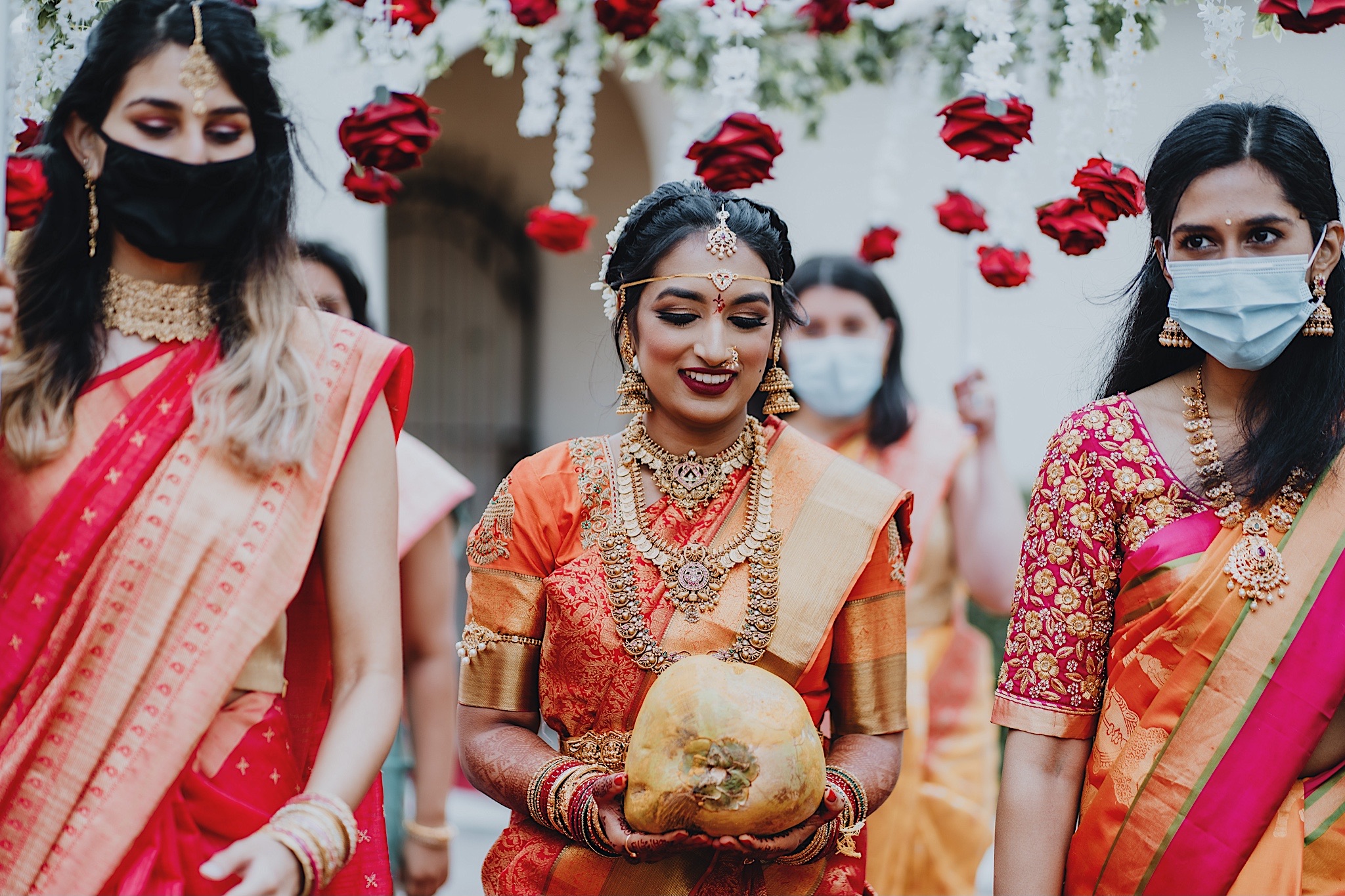 The bride had a beautiful floral canopy when she walked down the aisle for the ceremony. We got a variety of shots during the ceremony and when she changed into her second saree for the rest of the ceremony. Several different fun and emotional moments during the ceremony were captured both documentary style and artistic, candid style.