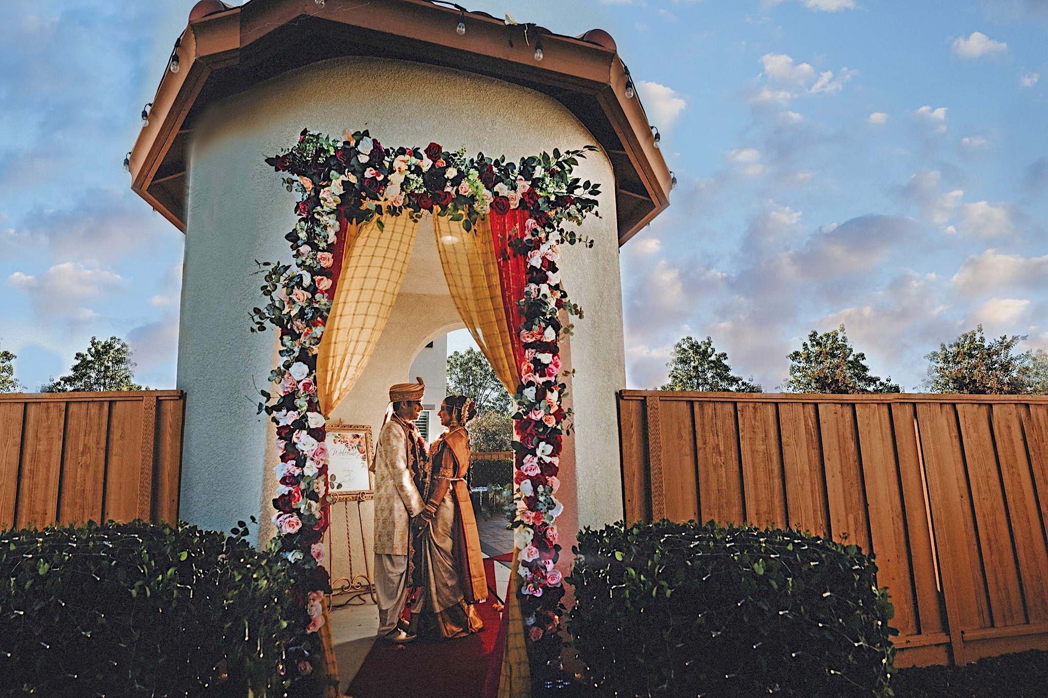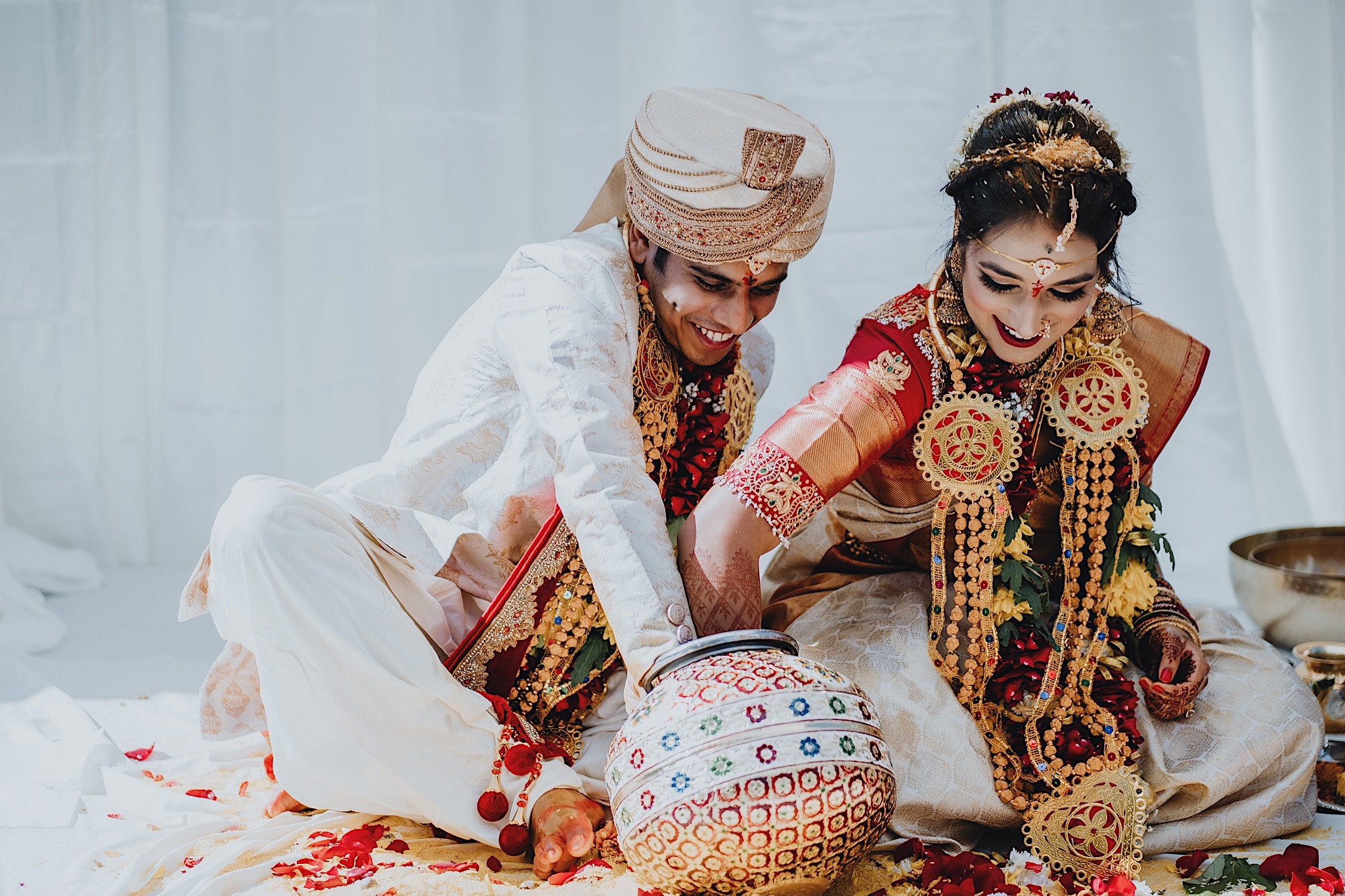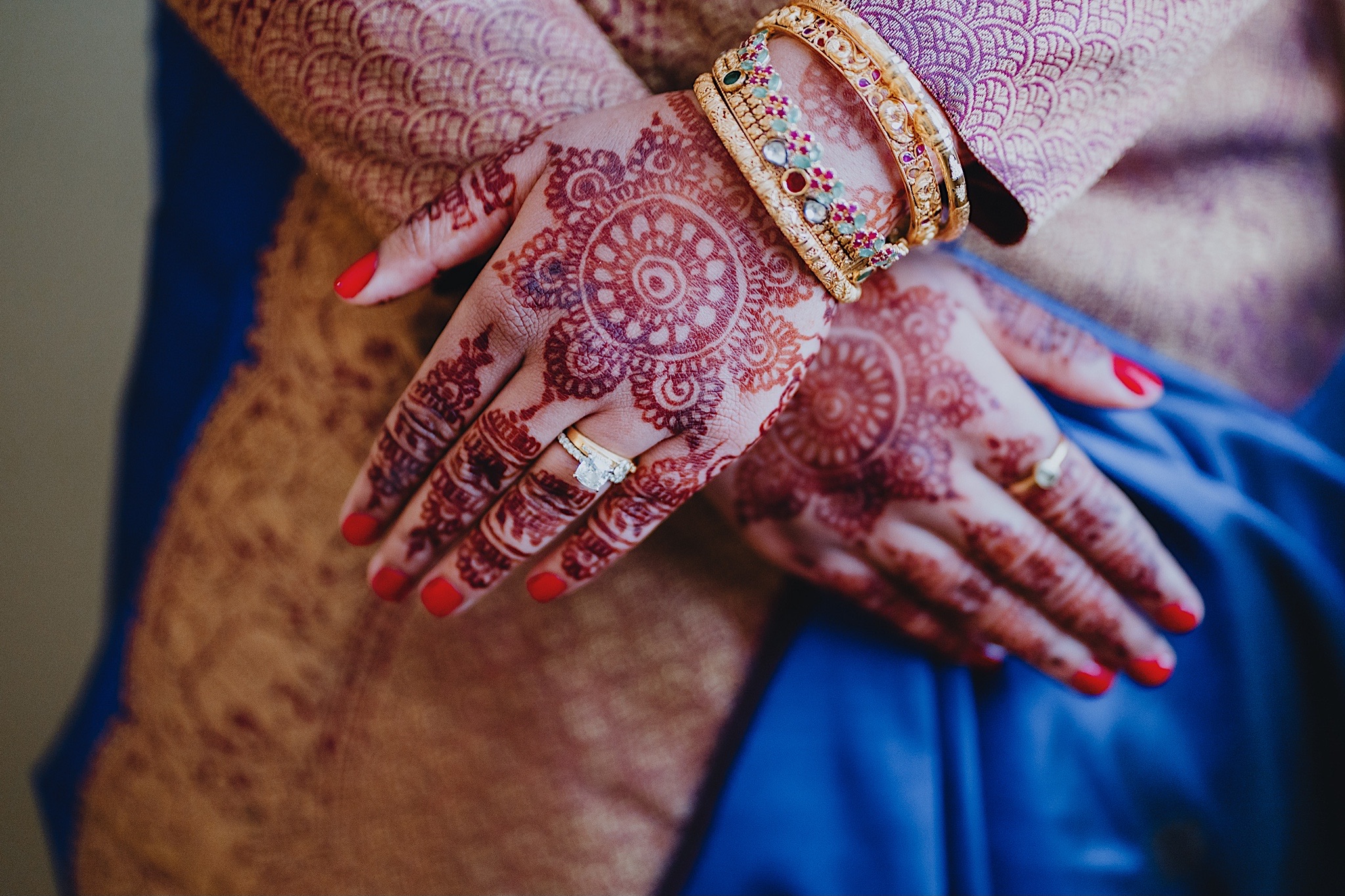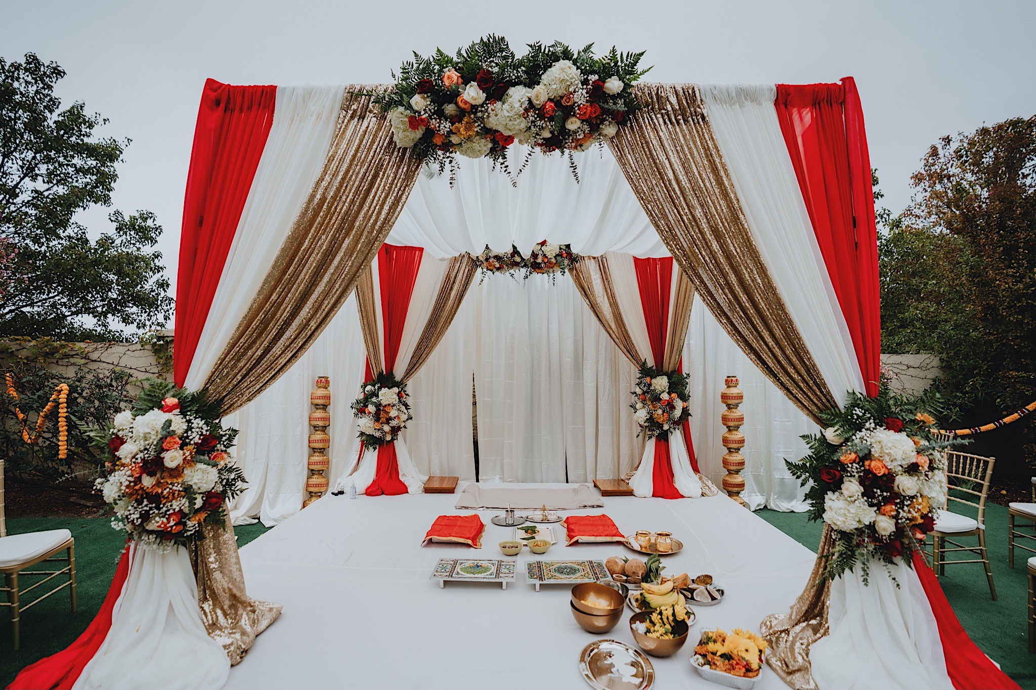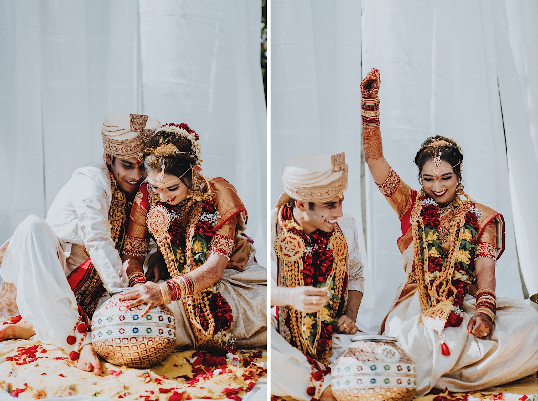 The bride had a beautiful floral canopy when she walked down the aisle for the ceremony. We got a variety of shots during the ceremony and when she changed into her second saree for the rest of the ceremony. Several different fun and emotional moments during the ceremony were captured both documentary style and artistic, candid style.
